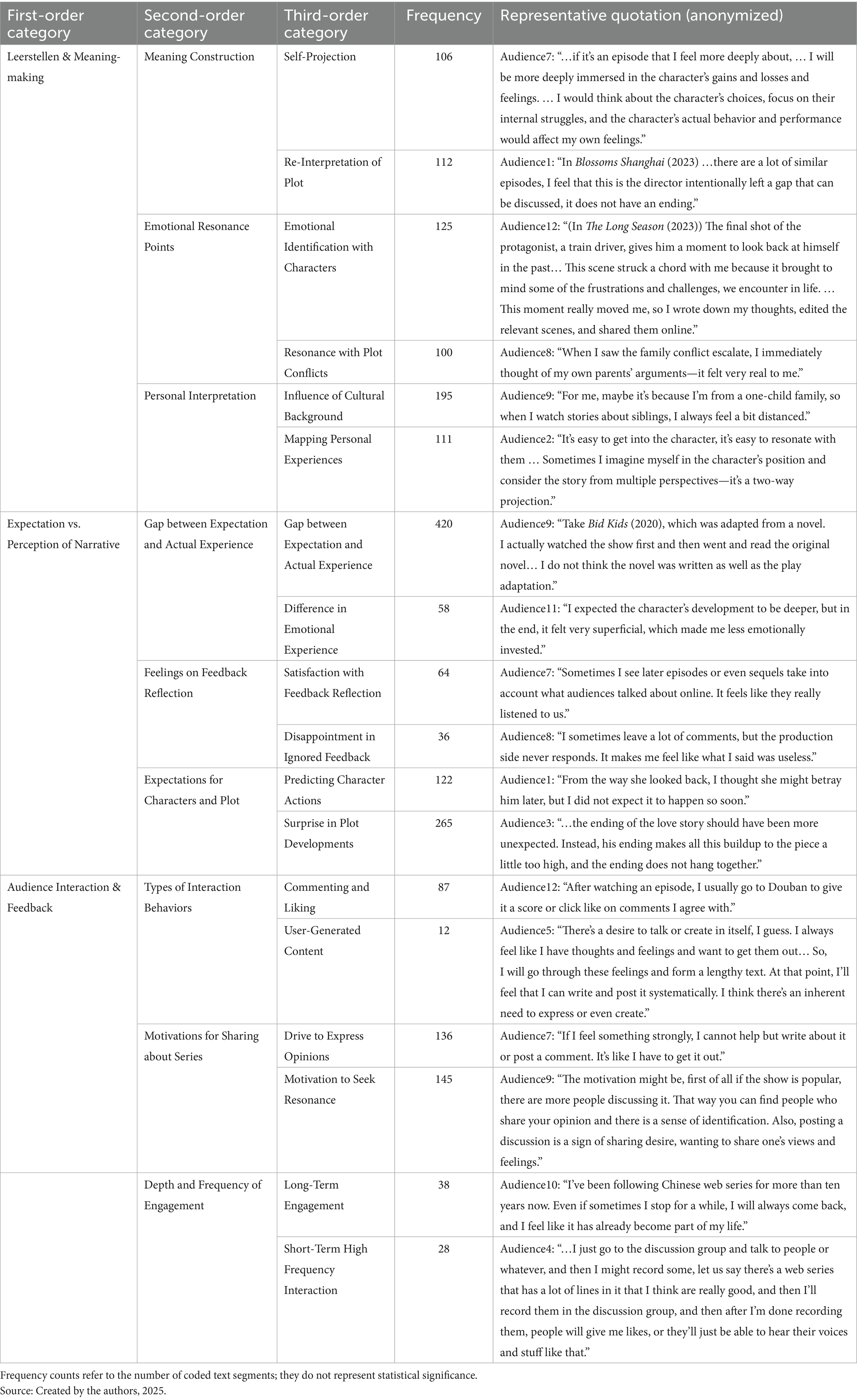 The analysis of viewers’ data shows that their meaning construction is highly dependent on self-projection (106 counts), plot reinterpretation (112 counts), and text filling (Leerstellen, Iser, 2014) (Table 4). Unlike traditional film and television audiences, web series viewers are not passive receivers during the viewing process, but rather reshape the plot understanding through their own experiences and social contexts, and even form secondary creations on social platforms. As one participant noted, “Sometimes I imagine myself in the character’s position and consider the story from multiple perspectives—it’s a two-way projection” (Audience 2). Another added, “This moment really moved me, so I edited the relevant scenes and shared them online to connect with others” (Audience 12). These practices exemplify how audiences transform reception into a participatory meaning-making process.