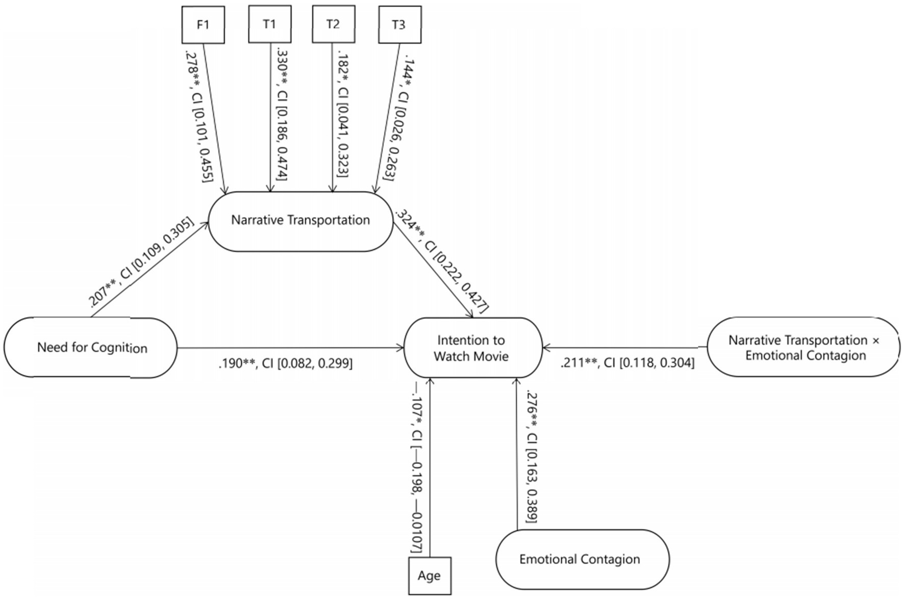In accordance with the proposed model and the results of the preliminary difference tests, this study employed Structural Equation Modeling (SEM) to test a moderated mediation model. The model specified need for cognition as the independent variable, narrative transportation as the mediator, and intention to watch movie as the dependent variable. Emotional contagion was included as the moderator, regulating the effect of narrative transportation on intention to watch movie. Additionally, age, viewing frequency, and viewing duration were included as covariates.