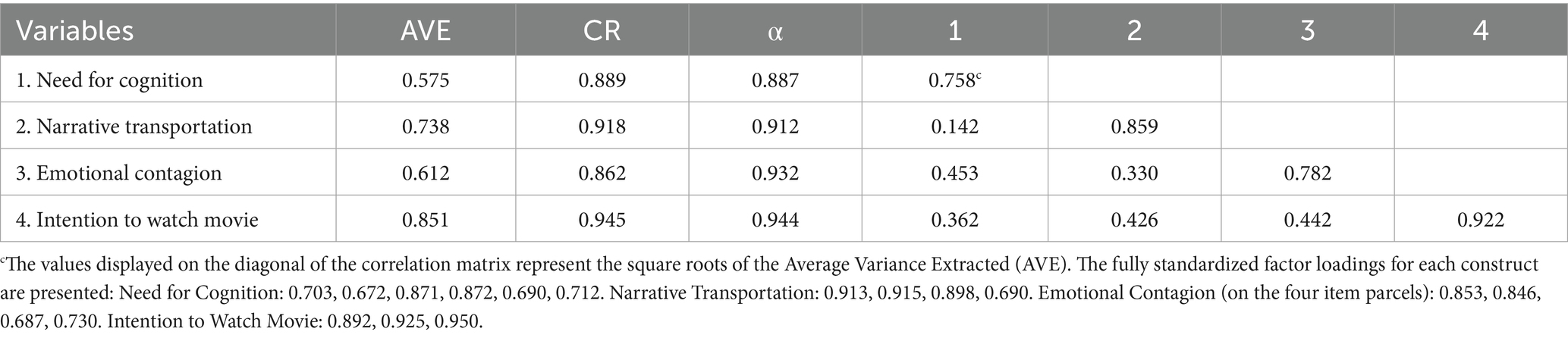 To assess common method bias, this study performed confirmatory factor analyses comparing a four-factor correlated model (with the factors being narrative transportation, cognitive need, intention to watch movie, and emotional contagion) against a single-factor model. The model-data fit indices are presented in Table 3. The results indicated that the four-factor correlated model demonstrated a good fit to the data, whereas the single-factor model showed a poor fit. This suggests that common method bias was not a substantial concern in this study.