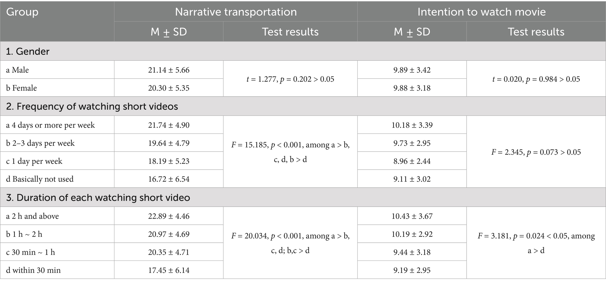 Table 5 presents the results of the difference tests for narrative transportation and intention to watch movie across gender, the average frequency of watching film-related short videos per week, and the duration of each viewing session. The key findings from Table 5 are as follows: