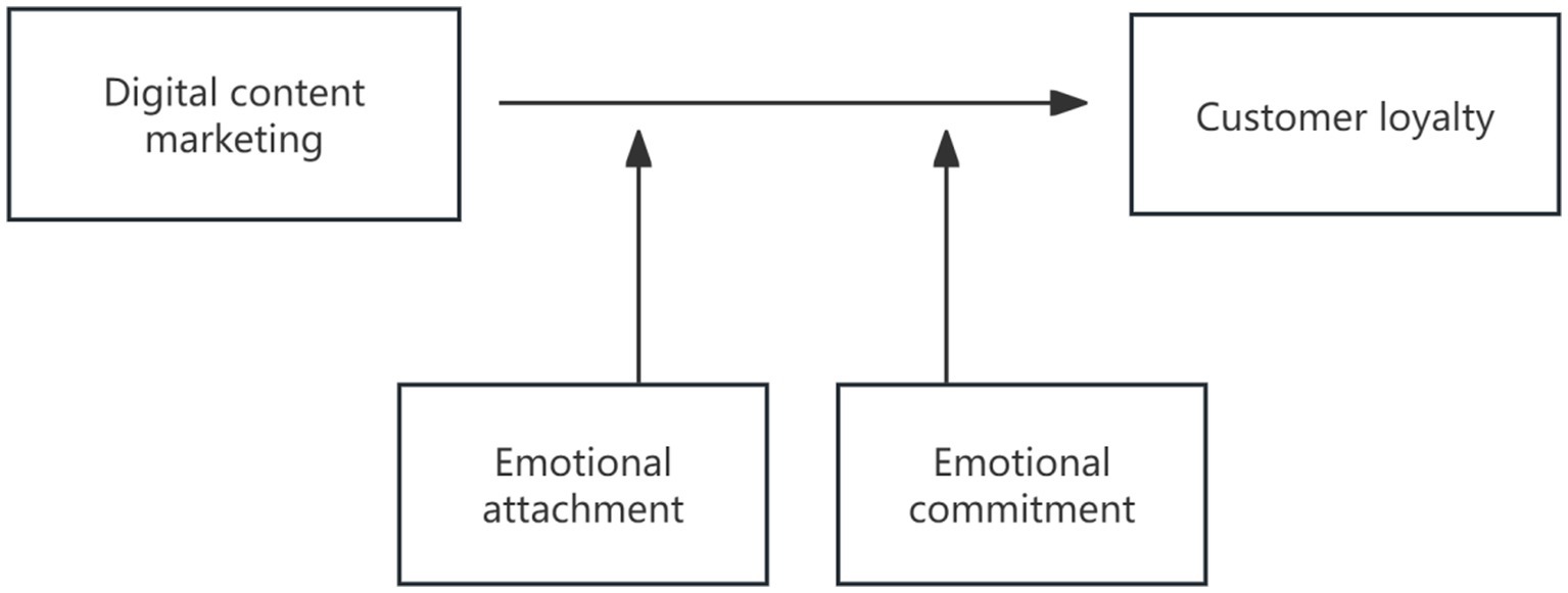 However, the impacts of digital content marketing on customer loyalty are inconsistent. Since consumers are unable to actually test the quality of goods, content on social media will create unrealistic and too high expectations from the performance of products (Gubalane and Ha, 2023; Kothari et al., 2025). In the case such expectations do not materialise in real products, the purchasing decision of customers will be dramatically influenced (Jia et al., 2023). The process of online purchasing enhances the possibility and tendency for consumers to be cheated and deceived (Ahmed and Othman, 2024; Abu-Rahme et al., 2025). Misleading information can weaken customer trust and satisfaction, leading to a decline in customer loyalty (Azer and Alexander, 2020; Ahmed et al., 2025; Unnisa and Garg, 2025). Furthermore, frequent content marketing on social media tends to trigger consumer boredom, causing them to ignore such content (Voigt et al., 2021; Geng et al., 2024). Riedel et al. (2024) has found that most customers have a negative attitude towards intrusive marketing, and compulsive and intrusive content will reduce consumers’ perceived value of products and cause negative reactions (Li et al., 2022). Not only do these negative responses destroy the trust of consumers, but they also reduce the image of the brand, which leads to the loss of customer loyalty (Farid and Hammad, 2022). Tayeb et al. (2024) indicate that webpage advertisements cannot attract the attention of consumers easily. Excessive digital content will trigger consumers’ resentment to brands, especially when they are looking for valuable information. Because of the internet’s quick expansion, the massive influx of information has led consumers to be more resistant to digital content, often avoiding interruptions by closing pop-up windows or installing blocking software (Xu et al., 2020; Ali et al., 2021; Liu et al., 2021; Siddique et al., 2021; Jamil et al., 2022; ShiYong et al., 2022; Wang et al., 2022). Therefore, digital content that lacks personalisation and practical value is difficult to attract users and may even damage the brand’s image, thereby weakening customer loyalty (Li et al., 2022). Although previous studies have shown inconsistent impacts of digital content marketing on customer loyalty, few studies have deeply explored the underlying emotional mechanisms (Yan et al., 2024). As explained from some previous studies, the influencer-based digital marketing relies heavily on the emotional factors—visual appeal and deep impressions have a huge effect on consumers’ loyalty and trust (Sukmana and Kim, 2024; Iswanto et al., 2025). In contrast with rational judgements, the result shows that consumers’ emotional dimensions determine the effectiveness of digital content marketing. This perspective provides an important theoretical foundation to explore how emotional attachment and emotional commitment moderate the relationship between digital content marketing and customer loyalty. Therefore, the present research explores the impact of digital content marketing on customer loyalty and hypothesised: