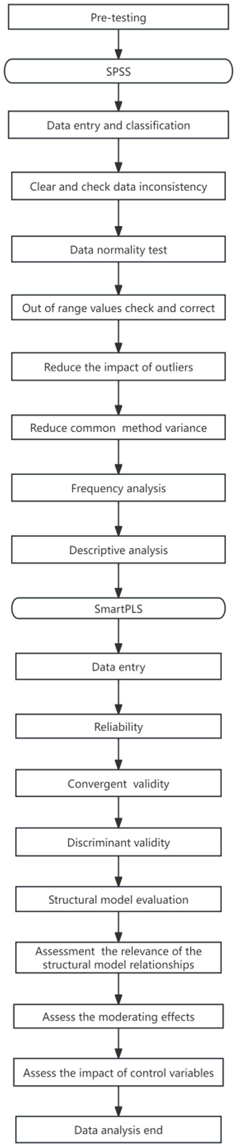 Conducted initially was data cleaning through SPSS software, where identified were inconsistencies needing resolution alongside completion of frequency and descriptive stats analyses. Partial least squares structural equation modelling (PLS-SEM) served as the methodological basis for the study (Alsouki et al., 2023). This approach was selected due to its efficiency in handling limited sample sizes. In addition, it does not impose rigid normality assumptions (Hair and Alamer, 2022). PLS-SEM can directly examine moderating effects by constructing interaction terms without considering data normality and variance issues, making it highly suitable for this conceptual model (Hair et al., 2021; Hair and Alamer, 2022). Recently, similar analytical methods have been successfully applied to studies of machine learning and predictive models to analyse behaviour (Lestari et al., 2024; Saputra and Hidayat, 2024; Dewi and Kurniawan, 2025). Subsequently, SmartPLS was employed to evaluate scale reliability and validity. Further, the SmartPLS software was applied to examine the variables’ impacts in the proposed framework (Lorenzo et al., 2022). Thus, the main analyses in this study involved testing the pathway relationships and verifying the moderation effects using SmartPLS procedures, aimed ultimately at validating the hypotheses. The process of data analyses with SPSS and SMARTPLS is presented in Figure 3.