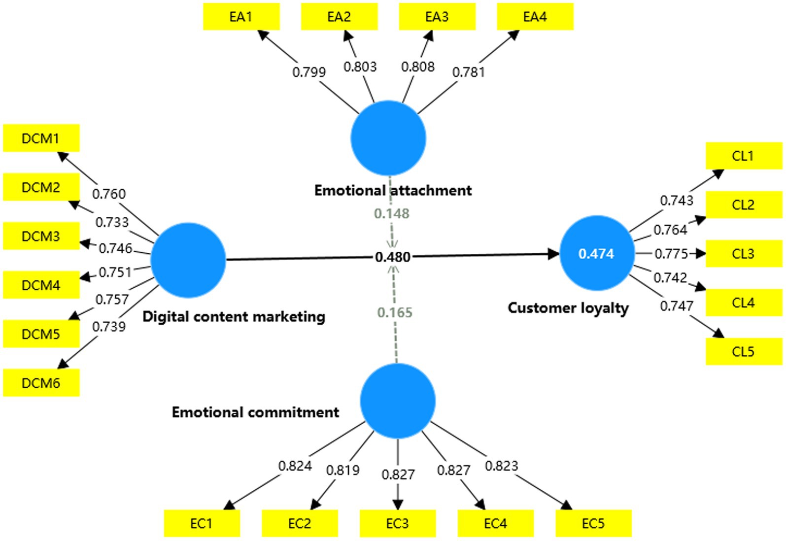 Overall, the results show that social media’s digital content marketing has a positive impact on customer loyalty. Further, emotional attachment and emotional commitment positively moderate the relationship between digital content marketing and customer loyalty. This research mainly focuses on the impact of consumers’ emotional dimensions, assessing whether emotional factors are the potential reasons for all consumers’ continuous purchasing behaviour. Multiple sets of control variables were also introduced to minimise the impact of interfering variables on the study’s findings. Structural equation modelling (SEM) was used to confirm that digital content marketing is strongly positively correlated with customer loyalty, while this relationship is positively moderated by emotional attachment and emotional commitment.