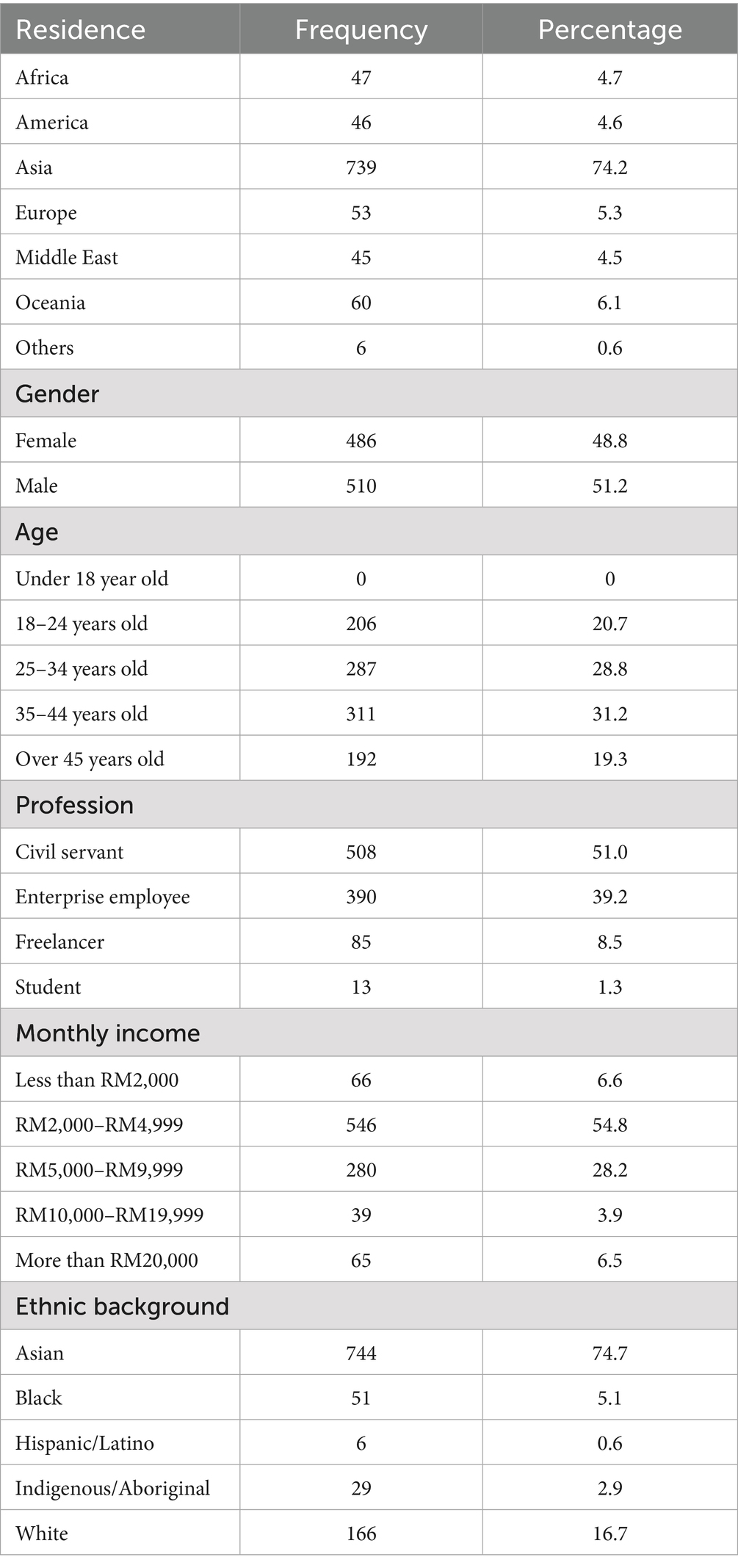 The study was based on a sample unit of individuals. Questionnaires were distributed to 1,185 consumers globally. Respondents were explicitly informed that the survey was to be used for academic research only and that the principles of anonymity and confidentiality were strictly guarded. Respondents were contacted several times to increase the response rate. The quality of the returned questionnaires was strictly screened, and 189 questionnaires with anomalies were excluded for reasons such as all the answers were the same or the respondents did not follow any online influencers. Ultimately, this study analysed the information received from 996 valid questionnaires involving 20 instruments. The effective response rate was 84.1%. The respondents came from 8 different regions, with 12 ethnic backgrounds, 4 age groups, 4 occupational backgrounds, and 5 income levels. This research screened respondents to include only customers who consistently follow certain online influencers, thus enhancing the representativeness of the results. The detailed data of the respondents are shown in Table 1.