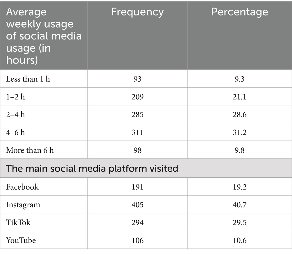 Table 2 shows the usage pattern of social media among the study participants. The majority of participants indicated that they used social media between 2 and 6 h per week, with 31.2% using social media for 4–6 h and 28.6% using it for 2–4 h. A small percentage of the sample (21.1%) used social media between 1 and 2 h per week, 9.8% used it for more than 6 h per week, and 9.3% used it for less than 1 h per week. In terms of social media platform preference, Instagram is the most frequently visited platform by respondents (40.7% of the respondents), followed by TikTok (29.5%), Facebook (19.2%), and YouTube (10.6%). The data provides evidence of the dominance of Instagram and TikTok in terms of social media usage patterns among respondents. Results prove that visual orientation and short video platforms dominate contemporary digital marketing, in line with global digital consumption trends (Meng et al., 2024; Yang and Dongqi, 2025).
