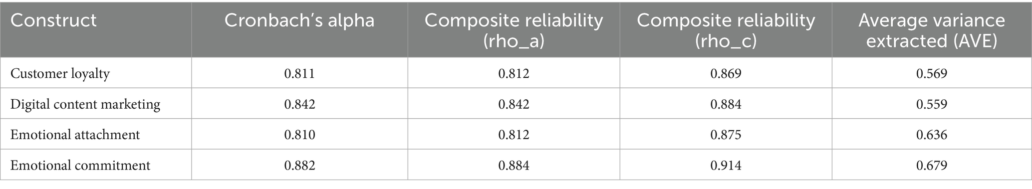 A five-point Likert scale with 1 (strongly disagree) to 5 (strongly agree) was used in all items. Higher structural validity and reliability have been presented by the five-point Likert scale compared to the four-point or three-point Likert scales (Malik et al., 2021; Aybek and Toraman, 2022; Kusmaryono et al., 2022; Obon et al., 2025). Previous studies Li et al. (2022) and Hasani et al. (2023) were adopted to assess the digital content marketing. Customer loyalty measurements were used from Hasani et al. (2023), and emotional attachment was designed from Shah et al. (2023). For the purpose of assessing emotional commitment, the research applied the scales provided by Maher and Zohra (2017) and Gogan et al. (2018). Respondents are anonymous in this questionnaire so that the respondents provide truthful answers and reliable data. Since Tan et al. (2022) explained that online questionnaires are an effective way to diminish social desirability bias compared to face-to-face surveys, and honesty among respondents and data validity were increased through anonymity. The Cronbach’s alpha method is more suitable for measuring indirect and potential variables, such as psychological traits. Compared to other criteria, Cronbach’s alpha is suitable for multiple items (Ha, 2020; Emini, 2021; Ha et al., 2021; Edelsbrunner et al., 2025; Team, 2025).