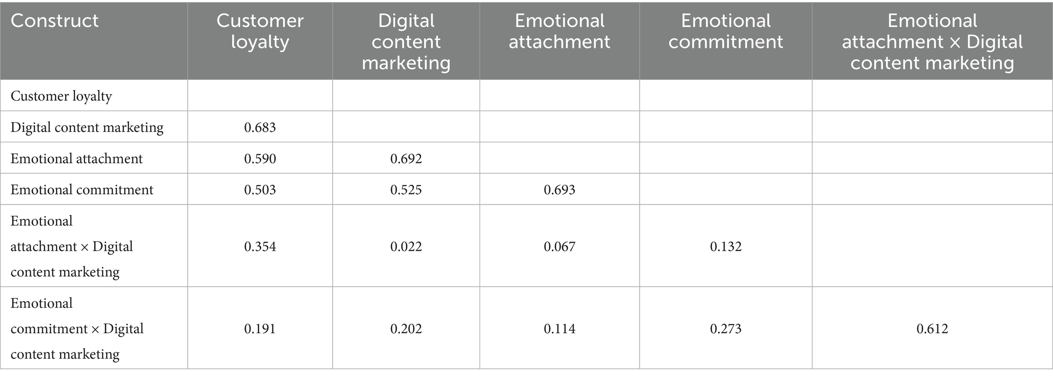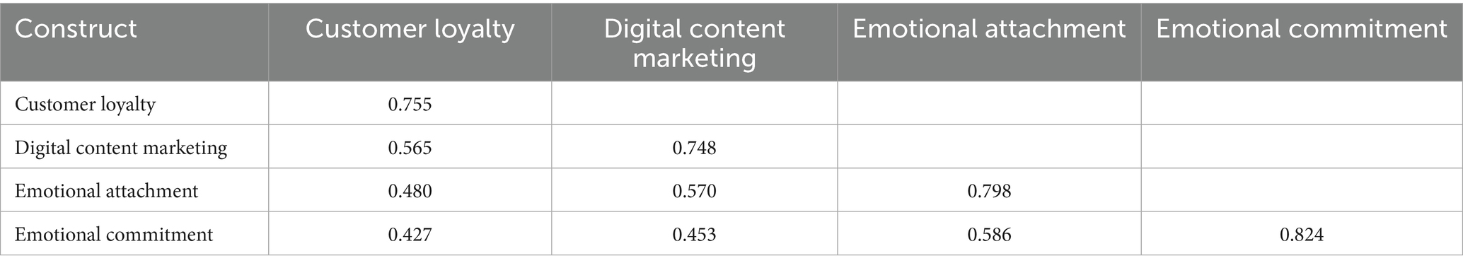 Table 3 shows that most of the study’s constructs have significant convergent validity, reflected in higher Cronbach’s alpha, composite reliability, and AVE values, which demonstrate the reliability and validity of the study’s constructs. Specifically, digital content marketing demonstrated good internal consistency (Cronbach’s alpha: 0.842), high reliability (rho_a: 0.842, rho_c: 0.884), and good convergent validity (AVE: 0.559). Emotional attachment showed good internal consistency (Cronbach’s alpha: 0.810), high reliability (rho_a: 0.812, rho_c: 0.875), and good convergent validity (AVE: 0.636). Emotional commitment showed good internal consistency (Cronbach’s alpha: 0.882), excellent reliability (rho_a: 0.884, rho_c: 0.914), and good convergent validity (AVE: 0.679). Finally, customer loyalty demonstrated good internal consistency (Cronbach’s alpha: 0.811), high reliability (rho_a: 0.812, rho_c: 0.869), and good convergent validity (AVE: 0.569). All constructs exceed the recommended thresholds, indicating that the scale has high consistency and reliability. However, the AVE of digital content marketing (0.559) is slightly lower than that of other variables, which may be affected by differences in content and platforms. Hananto and Srinivasan (2024) and Pratama (2024) validated construct validity through same indicators to demonstrate the robustness and methodological consistency of the measurement model in this research.
