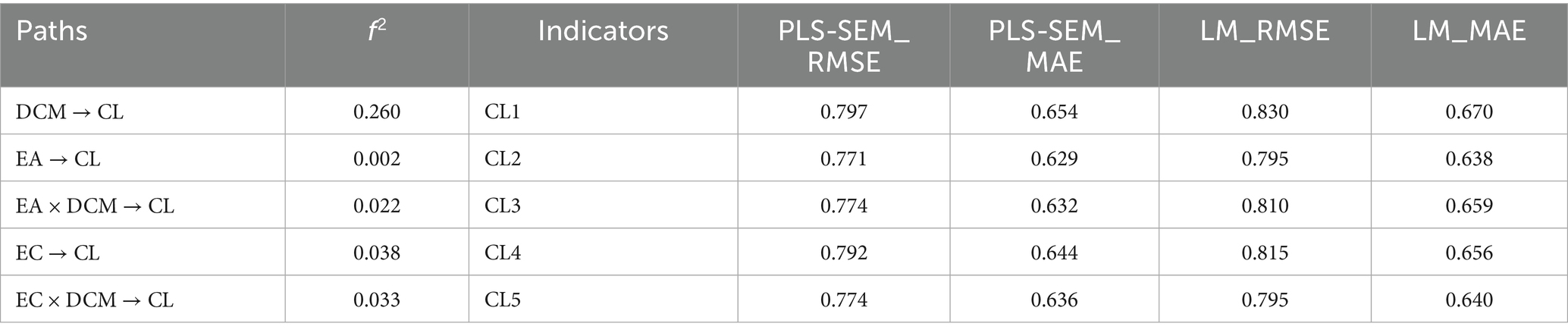 This research used the effect size f2 to examine the impact of exogenous latent variables on endogenous latent variables. As Martins Gnecco et al. (2024) states that f2 values of 0.02, 0.15, and 0.35 indicate small, medium, and large effects, respectively. The results showed that most paths have f2 values ranging from 0.022 to 0.260, indicating that the predictors have practical impacts. Among them, the effect size of EA → CL is only 0.002, which was negligible, consistent with the theoretical positioning of emotional attachment as a moderator, is described in Table 6. Hence, the model has good explanatory power.