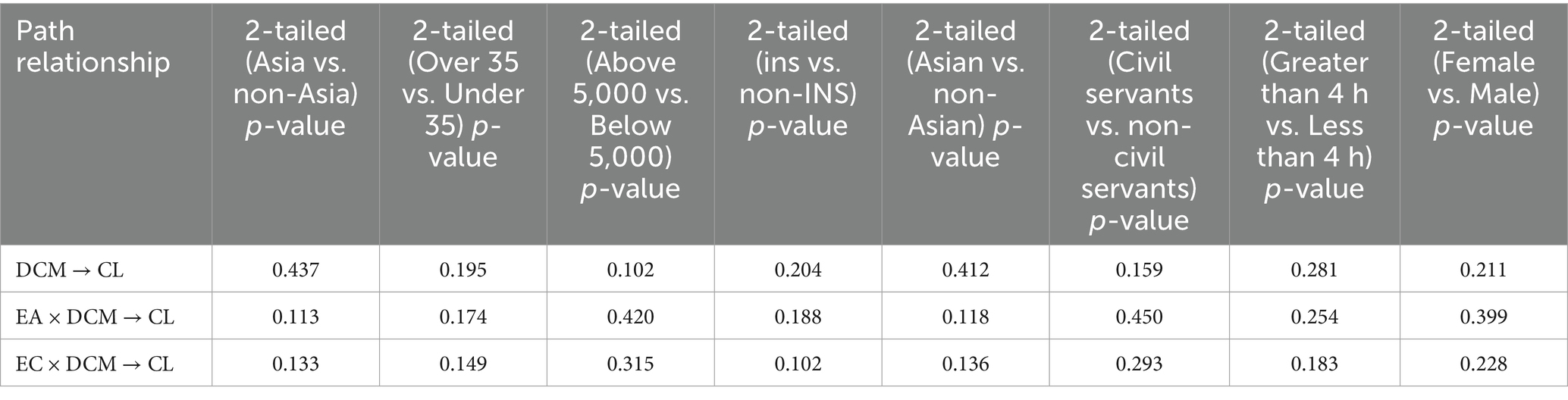 By analysing 996 samples in the MGA, this study found no significant difference between the three hypothesised paths in the conceptual model in different subgroups. The results are shown in Table 7. After the MGA by the subgroups of “location,” “gender,” “profession,” “age,” “monthly income,” “ethnic background,” “weekly time of social media use,” and “the main social media platforms used,” the study found the p-values of the three paths of the structural model were less than 0.05, indicating that the three hypothetical paths of the conceptual model do not have significant differences among subgroups, and the conceptual model is replicated.