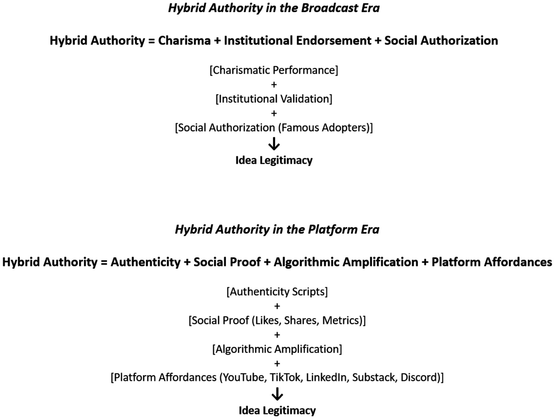 Figure 1 illustrates this conceptual shift. In the broadcast era, authority was secured through the combination of charisma and institutional endorsement. In the platform era, legitimacy emerges from the convergence of authenticity scripts, algorithmic amplification, social proof, and platform-specific affordances. Recognizing authority as hybrid and historically contingent highlights the need for management fashion theory to account for both human performances and non-human infrastructures.