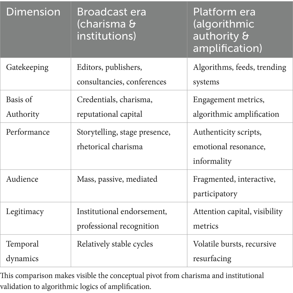 The contrast between the broadcast and platform eras can be understood as a shift in how authority is constructed in management fashion diffusion. In the broadcast era, legitimacy was closely tied to the charisma of the guru and the endorsement of established institutions like Harvard and Stanford. Management thinkers such as Peter Drucker, Tom Peters, and Stephen Covey gained recognition through a combination of rhetorical skill, publishing success, and professional credentials (Collins, 2019; Jackson, 2001). Authority was conferred through human performance and institutional validation, with credibility flowing from personal charisma and reputational capital.