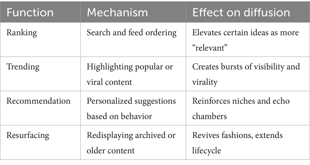 The curatorial role of algorithms can be differentiated into distinct functions. Table 2 summarizes key modes of algorithmic curation and their effects on the diffusion of management fashions. By distinguishing these mechanisms, it becomes clear that algorithms do not merely filter information but actively shape the temporalities and hierarchies of managerial ideas.