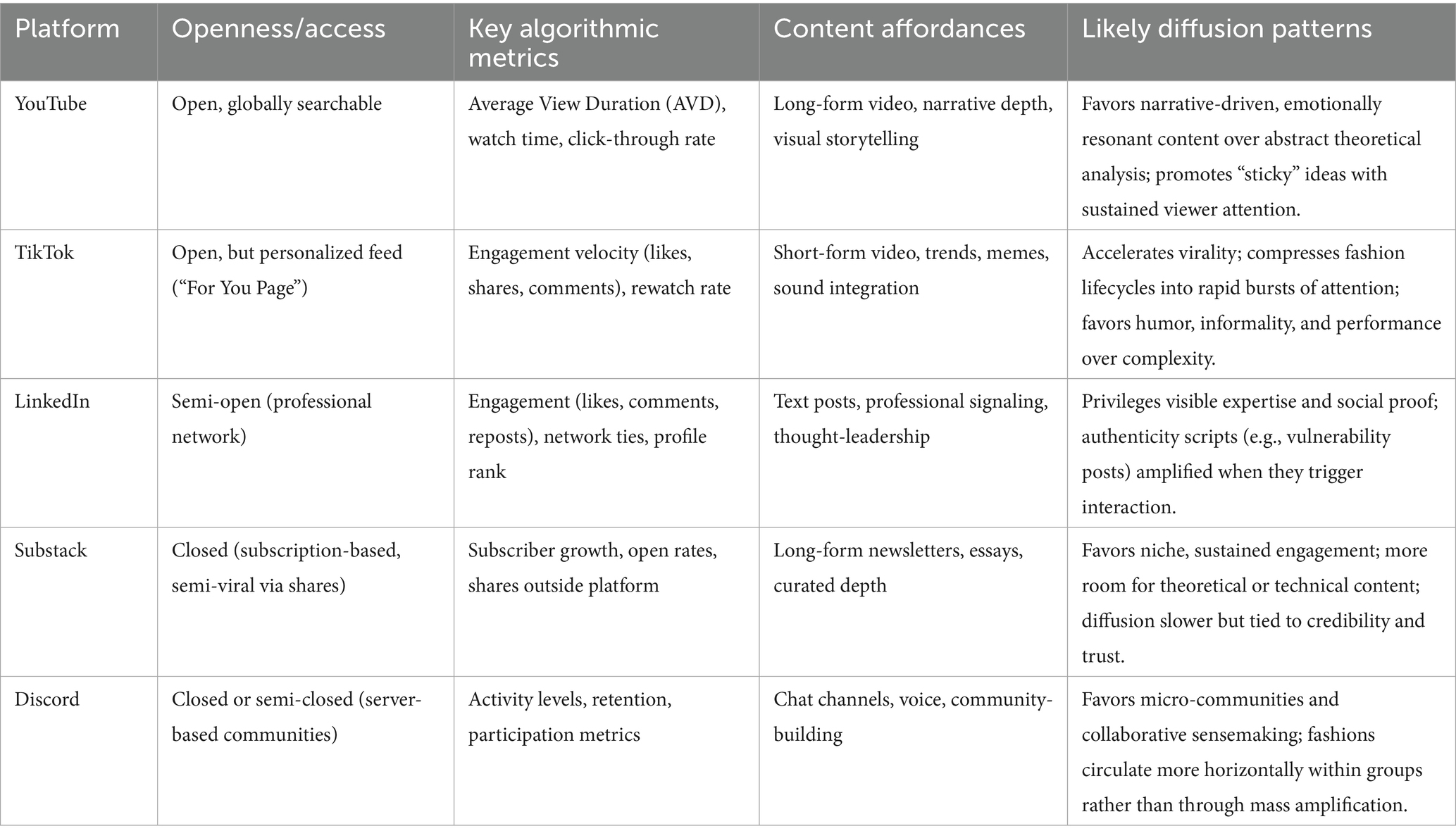Yet algorithms do not operate uniformly across platforms, and the affordances of each environment profoundly shape diffusion dynamics (Bucher and Helmond, 2018; Ronzhyn et al., 2023). Open platforms such as YouTube, for example, reward average view duration, which incentivizes creators to produce narrative-driven, emotionally resonant content rather than abstract theoretical analysis. TikTok emphasizes engagement velocity, privileging performance, humor, and rapid bursts of virality. LinkedIn, as a semi-professional network, amplifies thought-leadership content that aligns with authenticity scripts and stimulates interaction (Orgad, 2024; TorontoDigits, 2025). Substack, by contrast, cultivates niche legitimacy through subscription-based trust, sustaining more theoretical or technical writing. Discord exemplifies a community-driven model where fashions are co-constructed within bounded groups, rather than being broadcast algorithmically.