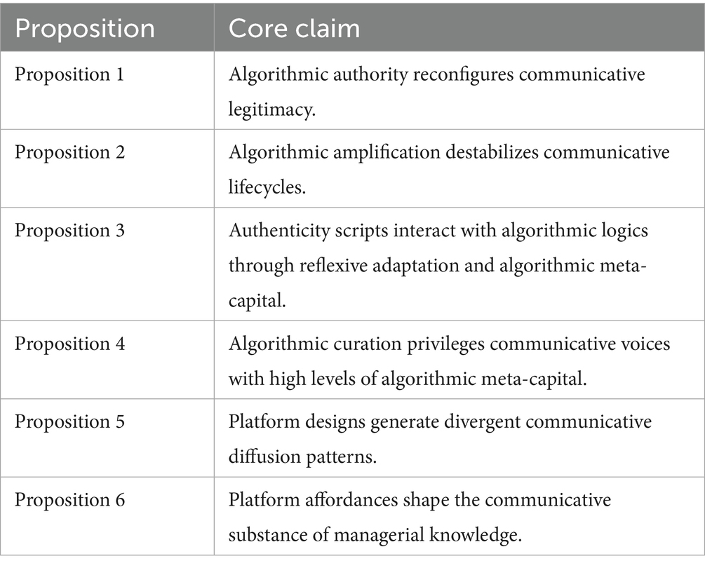 These developments underscore that management fashion diffusion in the platform era is not simply faster or more visible but structurally different. Authority, legitimacy, and resonance are now co-produced through a dynamic interplay of human expression, algorithmic mediation, and reflexive adaptation. Charisma has been partially replaced by calculative awareness, where actors must perform authenticity while understanding how platforms interpret engagement. This synthesis foregrounds several theoretical implications: the redefinition of legitimacy as communicative visibility, the emergence of algorithmic meta-capital as a new basis of authority, and the recursive, uneven nature of diffusion shaped by algorithmic design. The following propositions consolidate these insights into specific avenues for future research.