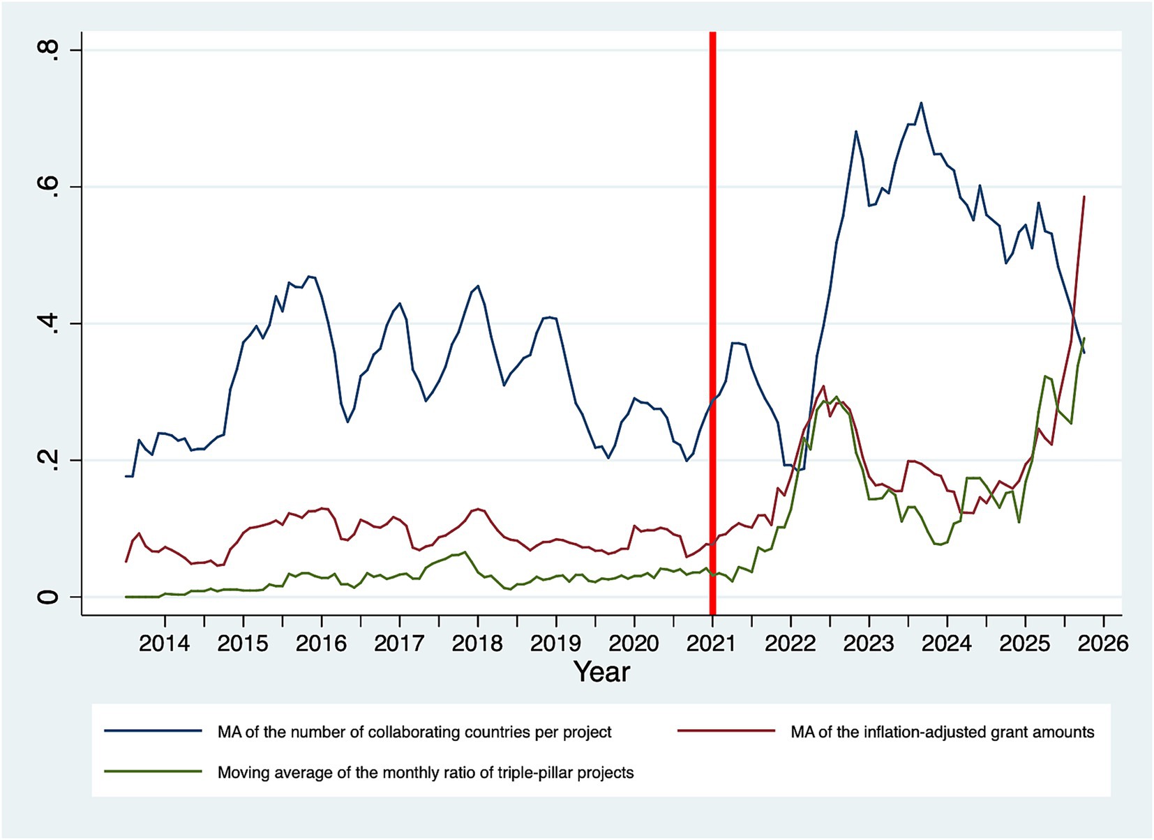 The data show a natural move toward multiple objectives and an acceleration and reshaping after the 2021 intervention. Projects became larger in budget on average but not necessarily broader in international scope. Figure 1 foreshadows the regression findings on time, the mandate, and interactions with grant size and collaboration.