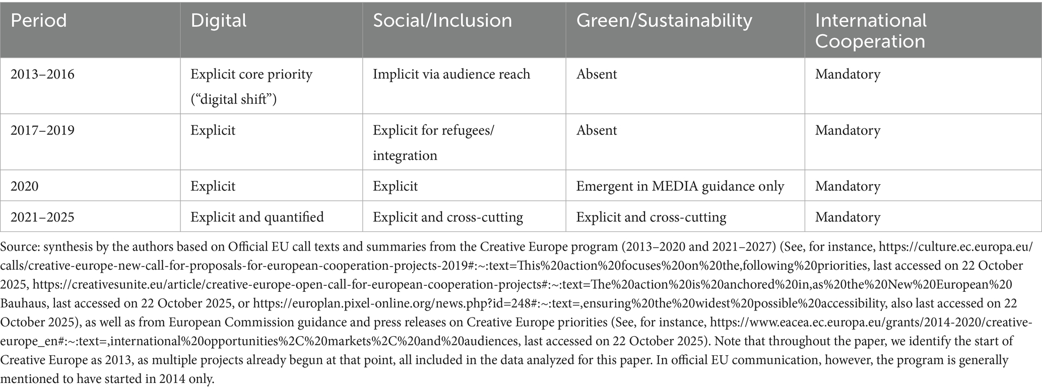 Before describing our classification of project objectives (Section 2.2.2), it is important to clarify the policy context and how it shifted over time, particularly its major change in 2021. During the 2013–2020 program period, Creative Europe calls strongly emphasized transnational collaboration and digital innovation, alongside improving cultural access as a social goal. From the very first calls, one of the core priorities was adapting the creative industries to the “digital shift,” encouraging new digital distribution models and use of new technologies in culture (Assembly of European Regions, 2018). Another recurring priority was audience development, which implicitly carried an inclusion aspect (e.g., reaching youth, minorities, or people with disabilities as new audiences for culture). Cross-border cooperation was a mandatory feature of nearly all projects. For instance, a typical Culture subprogram strand cooperation project had to involve partners from at least three different countries, and a Media subprogram film co-production often required broadcasters or producers from multiple EU states. However, environmental sustainability was notably absent from the formal criteria in this period. The calls issued between 2013 and 2019 did not require or explicitly mention “green” measures or climate-related objectives. For example, the 2015 caLL for European Cooperation Projects focused on the mobility of artists, audience engagement, and digital capacity, but contained no reference to environmental practices. Even as late as 2018, the priorities for the 2019 Cooperation Projects included international mobility, social integration of refugees, and promoting cultural heritage, yet no sustainability or climate action was asked of applicants (Assembly of European Regions, 2018). Similarly, in the Media subprogram, calls up to 2020 were centered around boosting cross-border circulation of films, embracing digital distribution (online platforms, video-on-demand), and expanding audiences, without imposing environmental criteria. The only hints of eco-consciousness emerged informally – by 2020, the film industry was starting to discuss “green shooting” and some Media guidelines encouraged sustainable approaches. However, these were not binding or evaluated in the grant decisions. In sum, under the 2013–2020 framework, “Digital” was a core explicit priority and “Social” (inclusion and access) became increasingly explicit, whereas “Green” was entirely absent as an objective (see our synthesis in Table 1). International cooperation was a given throughout, as a structural requirement of the funding schemes.