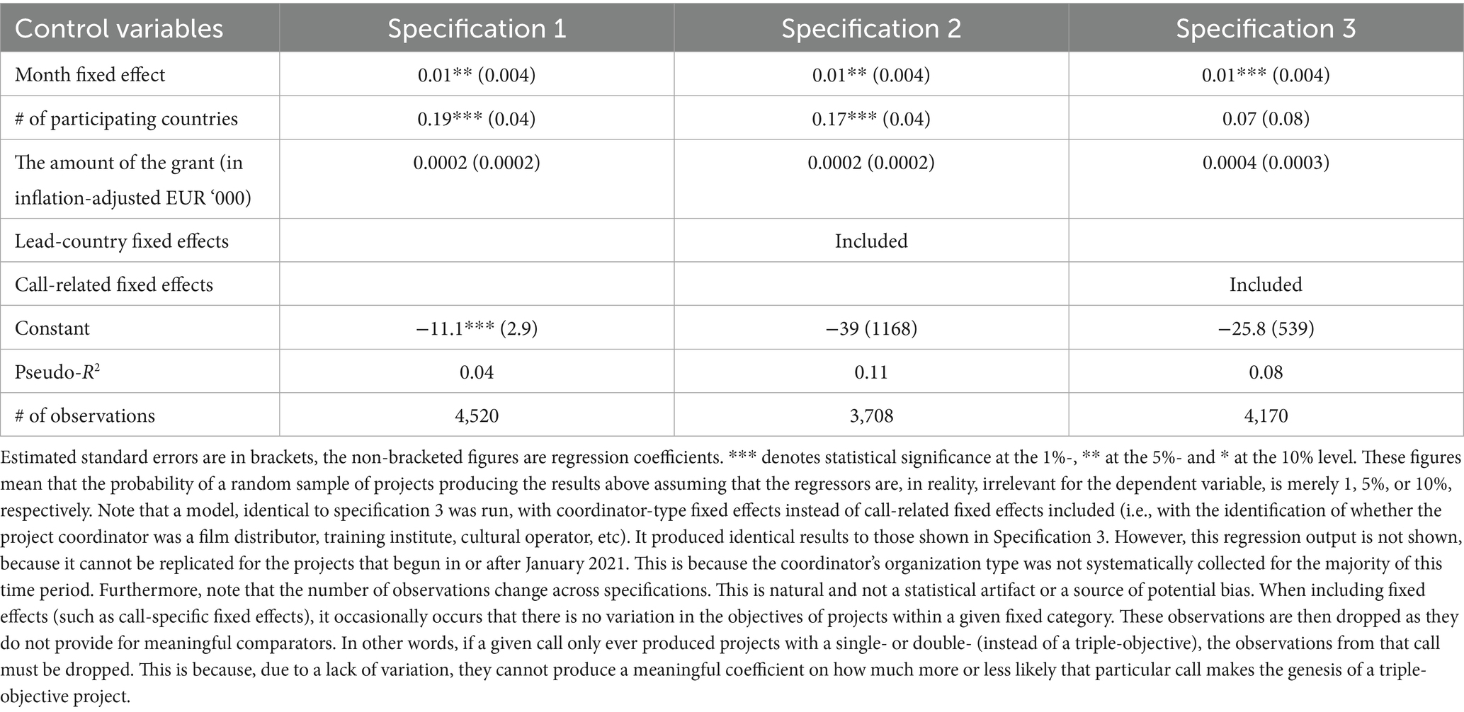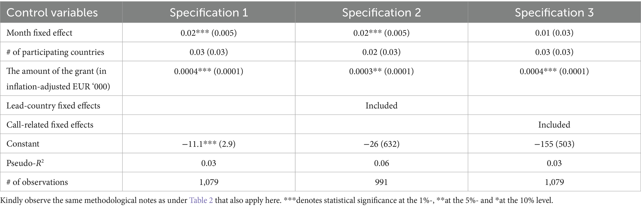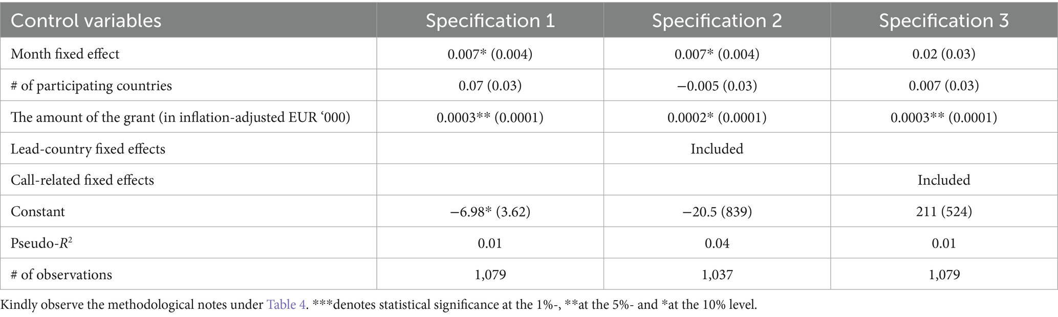 There are both similarities and differences across Tables 2, 3, but they all align with the testable hypotheses set out in the theoretical framework section. First, month fixed effects have a positive and generally statistically significant effect on the probability of any given project being triple-objective (instead of focusing on only one or two of the three pillars). This holds for all projects, independently of when they started. The coefficients range between 0.01 and 0.02. The odds ratios that they produce therefore range between e0.01 and e0.02, i.e., between 1.01 and 1.02. This entails that moving from one month to the next, the probability that any given project with otherwise the same attributes moves from a single- or double-pillar one and becomes triple-pillar increases by 1 to 2% on average. This is a ceteris paribus increase, meaning that it happens irrespectively of the values of all the other explanatory variables included in the regressions shown in Tables 2, 3. This increase is in relative terms and not in percentage points. For instance, if in a given month, the unconditional probability for a given project to be a triple-pillar one was 10%, the next month, this same probability for otherwise the exact same project would increase to 10.1–10.2%. This effect may seem weak from one period to another; however, it is important to note that it compounds over time. After just 5 years, these coefficients would predict a rise in probabilities from this initial 10 to 18.17–32.81%. Again, it is important to keep in mind that this probability increase refers to otherwise the exact same project – stemming from the same call, organized by an institution from the same country, having the same budget and the same number of different collaborator states.