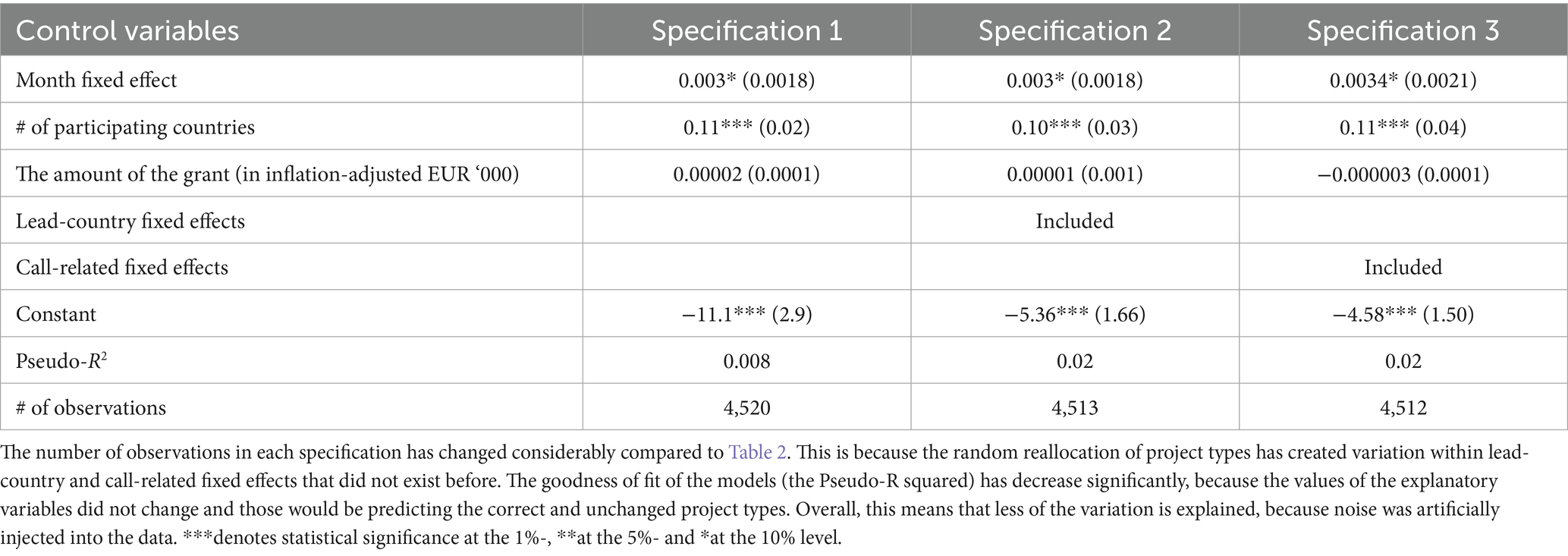The second panel concerns projects that started on or after January 2021. Table 5 mirrors the message of Table 3. The month effect remains positive and usually significant. The coefficient on the number of participating countries is small and not reliably different from zero across specifications. The amount of the grant remains positive and significant and thus continues to be the main predictor of triple pillar status after the mandate. This is exactly the qualitative picture in Table 2. Again, the constants and the pseudo-R squared values move. This is mechanical. The random flip breaks some of the within category variation that underpins the fixed effects. Some observations drop when there is no remaining variation inside a fixed category. This behavior is already described in the notes to Table 2, and it is amplified by the stress test. None of these mechanical shifts alters the signs or the economic interpretation of the structural coefficients.