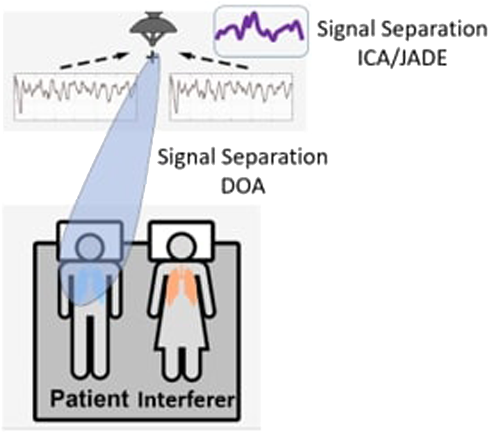 FIGURE 5. Illustration of challenges of respiration sensing in multi-subject environments. While it is possible to isolate one well-spaced subject’s respiratory signature from a combined mixture using direction of arrival (DOA), subjects closer together impose antenna array resolution limitations for DOA. Alternatively, the ICA/JADE algorithm can employ spectral analysis to isolate respiratory signaturesfor subjects in close proximity.