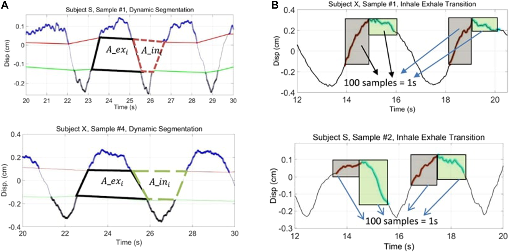 FIGURE 6. Respiratory pattern classifiers used for subject recognition. Dynamically segmented inhale/exhale area ratios of two subjects significantly differ, (A), as do signal patterns relating to the dynamics of breathing near the points where the inhale and exhale transition occurs, (B). From Rahman et al. (2018).