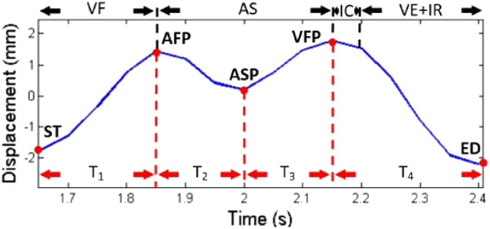FIGURE 7. Cardiac motion marker. The cardiac motion cycle defined by five different markers (red dots) at five different points of displacement and timing was calculated as a unique feature for recognizing people. From Lin et al. (2017).