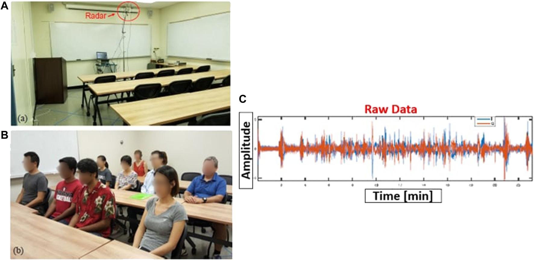 FIGURE 8. Radar-based subject presence detection and count. Experimental setup for radar measurement in a classroom, (A), filled with subjects for testing, (B), and raw radar data used for assessing presence, (C). From Yavari et al. (2018).
