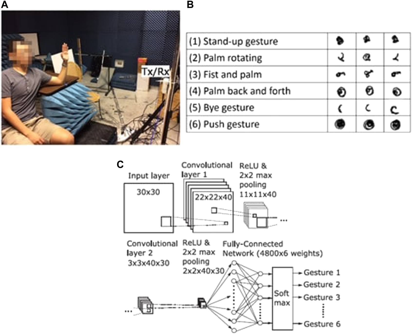 FIGURE 11. Radar-based hand gesture recognition. Experimental setup with subjects in seated position in front of the radar system in an anechoic chamber, (A), and example images of radar I/Q plots associated with gestures, (B), and block diagram of CNN used of pattern recognition, (C). From Sakamoto et al. (2018).