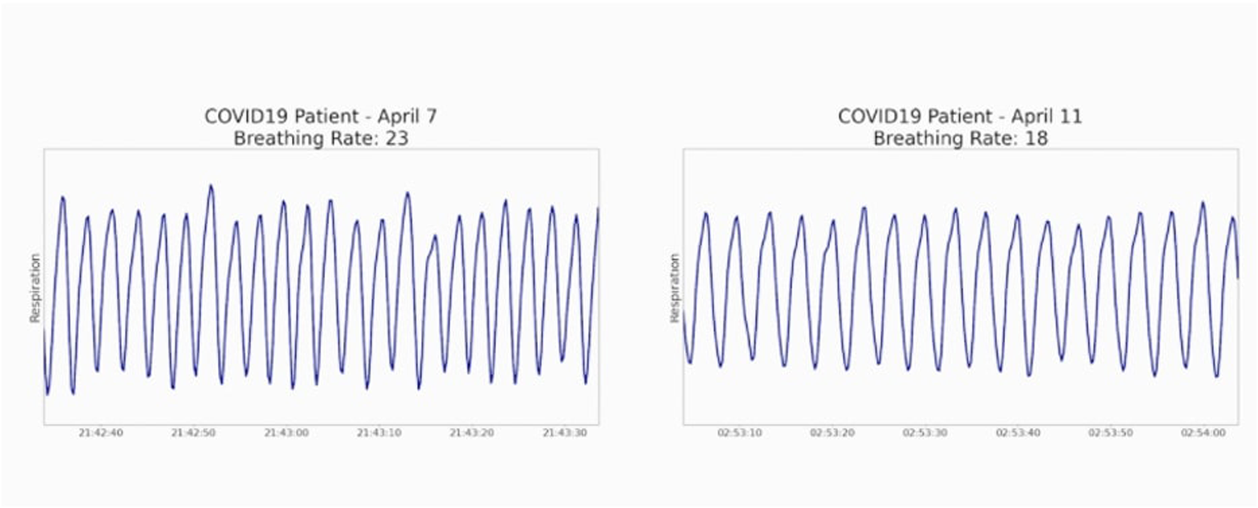 In another attempt, MIT’s Computer Science and Artificial Intelligence Laboratory (CSAIL) in collaboration with the Boston clinical team also reported some promising results of remote sensing of respiration of COVID-19 patients (Adam, 2020). MIT developed a Wi-Fi-like box called Emerald which also uses reflected wireless signals in the environment and artificial intelligence to infer people’s vital signs, sleep, and movement (Adam, 2020). This signal emits roughly 1,000 times less radiation than a standard cell phone so there are no known additional health hazards for this technique (Adam, 2020). Additionally, with prior consent, they installed their device into a COVID-19 patient’s room to monitor respiration, demonstrating efficacy for monitoring breathing rate and heart rate remotely, confirmed with checks by medical professionals (Adam, 2020). Figure 13 illustrates the results of the recorded breathing rate of COVID-19 patients in their home environment. Remote monitoring products like Emerald developed by MIT could also help to expand healthcare facilities as the demand on hospital spikes with an increasing number of COVID-19 patients. Additionally, safe, remote, non-contact, and continuous breathing monitoring could also allow hospitals and physicians to triage less severe patients and monitor them in their own home, while still allowing them to respond quickly in case of aggravated illness. Many other research groups and industries are working hard to bring this potential sensor technology into the real world to combat COVID-19.