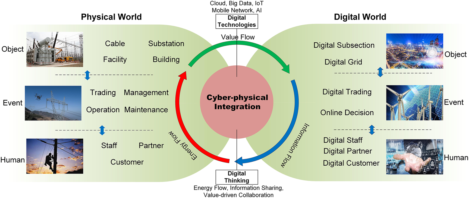 Figure 4 illustrates the conceptual framework of the CPPS. The objects, events, and human behaviors in the physical world are mapped into the digital world through the information network using state-of-the-art ICTs, to provide a digital image for the complex processes of power generation, operation, management, and control. In the digital world, digital thinking is used to implement power system modeling, simulation, testing, and monitoring, to make efficient production scheduling and planning of smart grid. The core of the CPPS lies in the energy flow, information flow, and value flow and they represent the physical, information, and value dimensions in the CPPS, respectively.