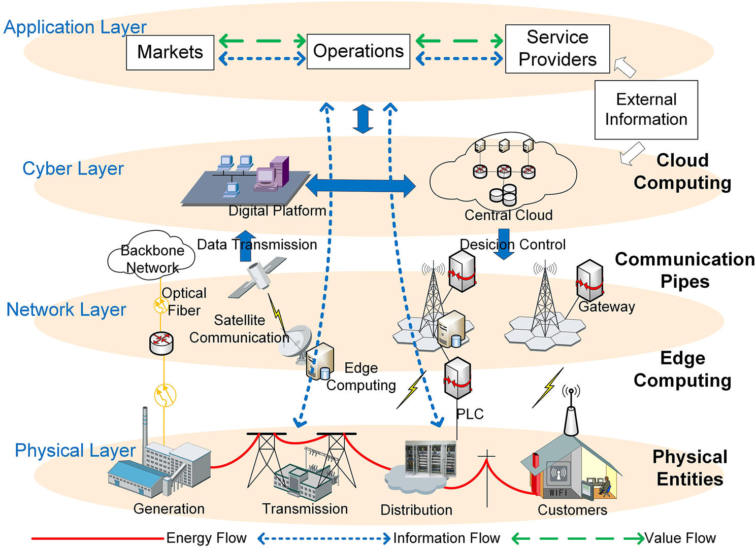 • Physical layer (i.e., facilities layer) is the fundamental layer of the architecture, including various physical facilities and executors in the grid. It is deployed in a distributed manner, and the decision-making instructions are executed in this layer to achieve the required system functionality. Also, the enery flows in a two-way fashion within this layer among the power generation, transmission, distribution, and customers.