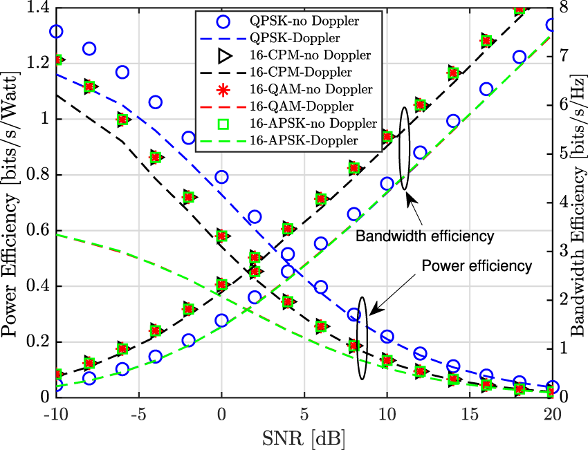 Going forward, the discussion herein seeks to pursue power- and spectral-efficient modulation schemes with the given transmitted power and channel bandwidth requirements. Such principal resources require considerable attention since they are not only vulnerable to channel uncertainty but also other constraints, such as HPA nonlinearities and Doppler effect, which are associated with SATCOMs. The utilization of such resources results in maximization of the bandwidth efficiency which is attained at the minimum cost of the average signal power. In this paper, it should be noted that the terms “spectral” and “bandwidth” are used interchangeably.