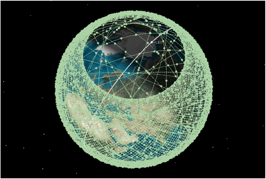 As described in their FCC filings (FCC, 2016b; FCC, 2020), Telesat’s system will consist of 298 satellites in the initial phase, and reach 1,671 satellites in the final phase. Ka-band frequencies will be utilized for both user and GW links, and the final constellation will operate with a minimum elevation angle of 10°. Two types of orbits will be used, high-inclined or polar orbits at 1,015 km, and low-inclined orbits at 1,325 km, with minimum elevation angle of 10°. As of 2023, Telesat Lightspeed constellation provides global coverage with 198 satellites for data and Telecom, mobility, government, and video (Telesat, 2023).