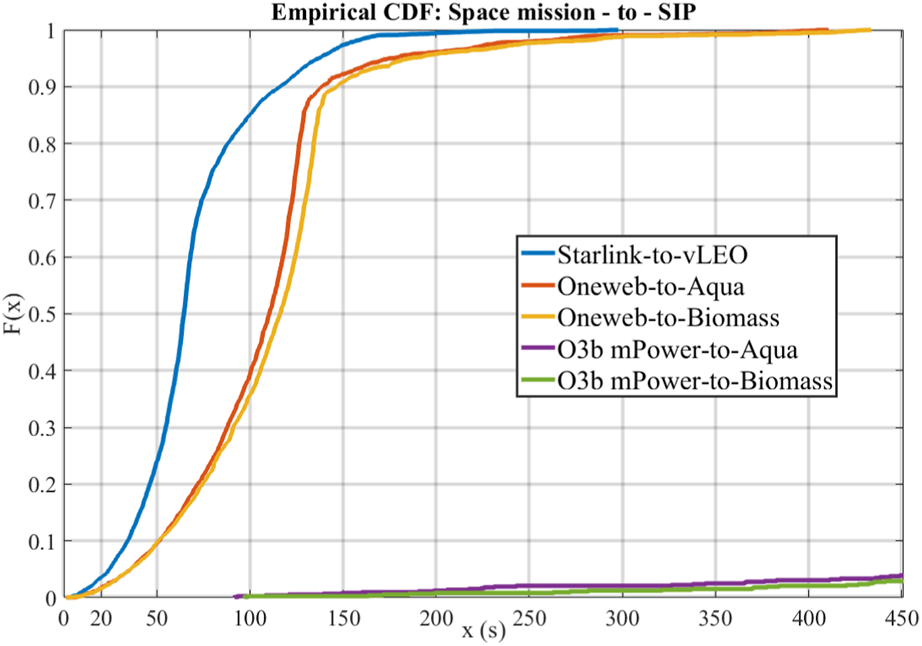 Accounting for the abundance of EO missions, their overwhelming need for broadband data rate, and the rarity of human space flight missions, we concluded that the first users of SIP connectivity are likely EO missions. Hence, we chose EO missions for the study and selected NASA’s past mission Aqua and ESA’s future mission BIOMASS as a reference. Their main features are given in Table 2.