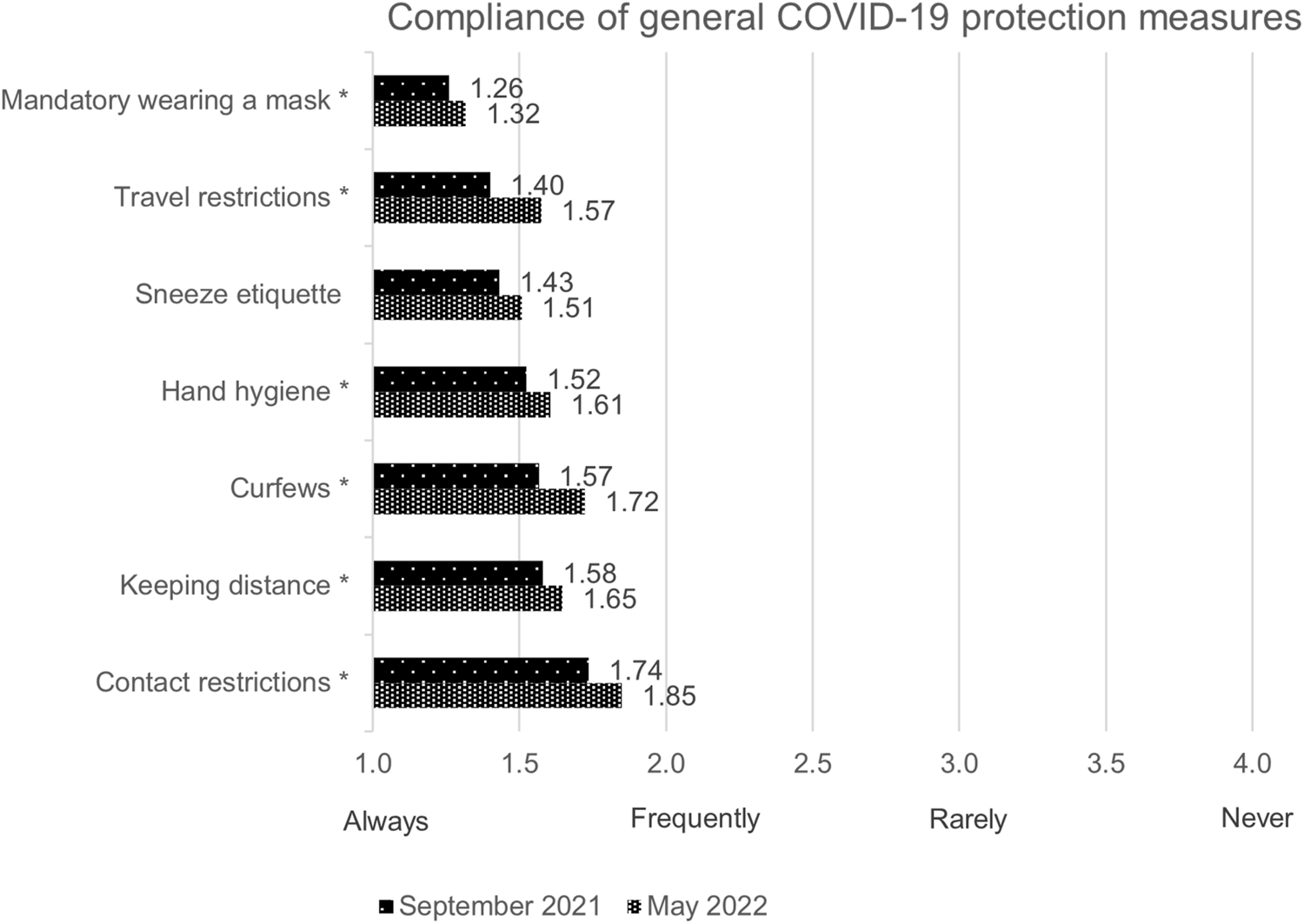 Figure 5. Compliance of general COVID-19 protection measures (comparison of means); own visualization.