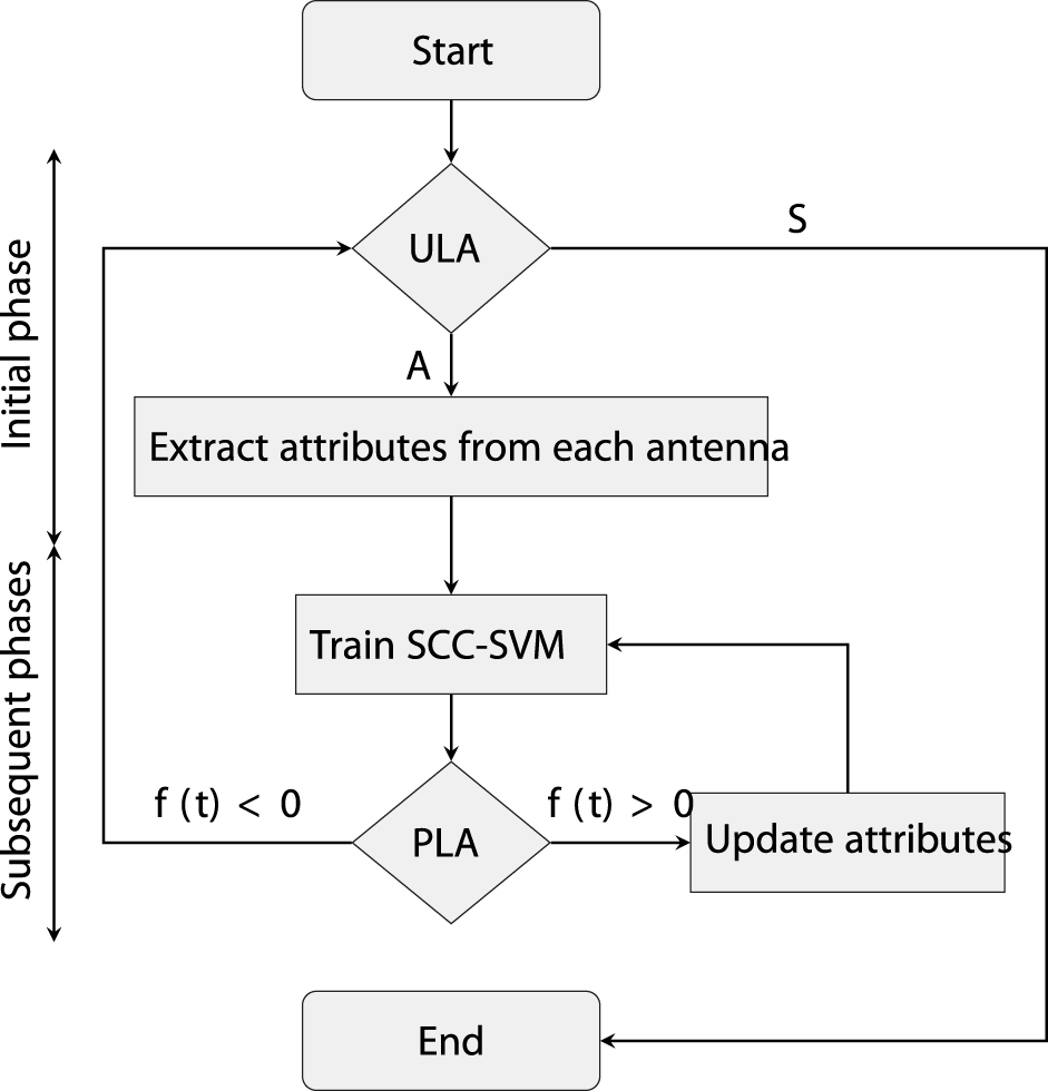 Figure 2 illustrates the proposed scheme. In the initial phase T1 following ULA authentication, data are obtained from the legitimate user (A) for SCC-SVM training. In subsequent phases, reference signal data from U are utilized by B for testing and training. If testing is successful in a given phase, the corresponding data are employed to update the attributes for training. A sliding window is used so the oldest data are discarded. Conversely, if testing fails, the connection is terminated.