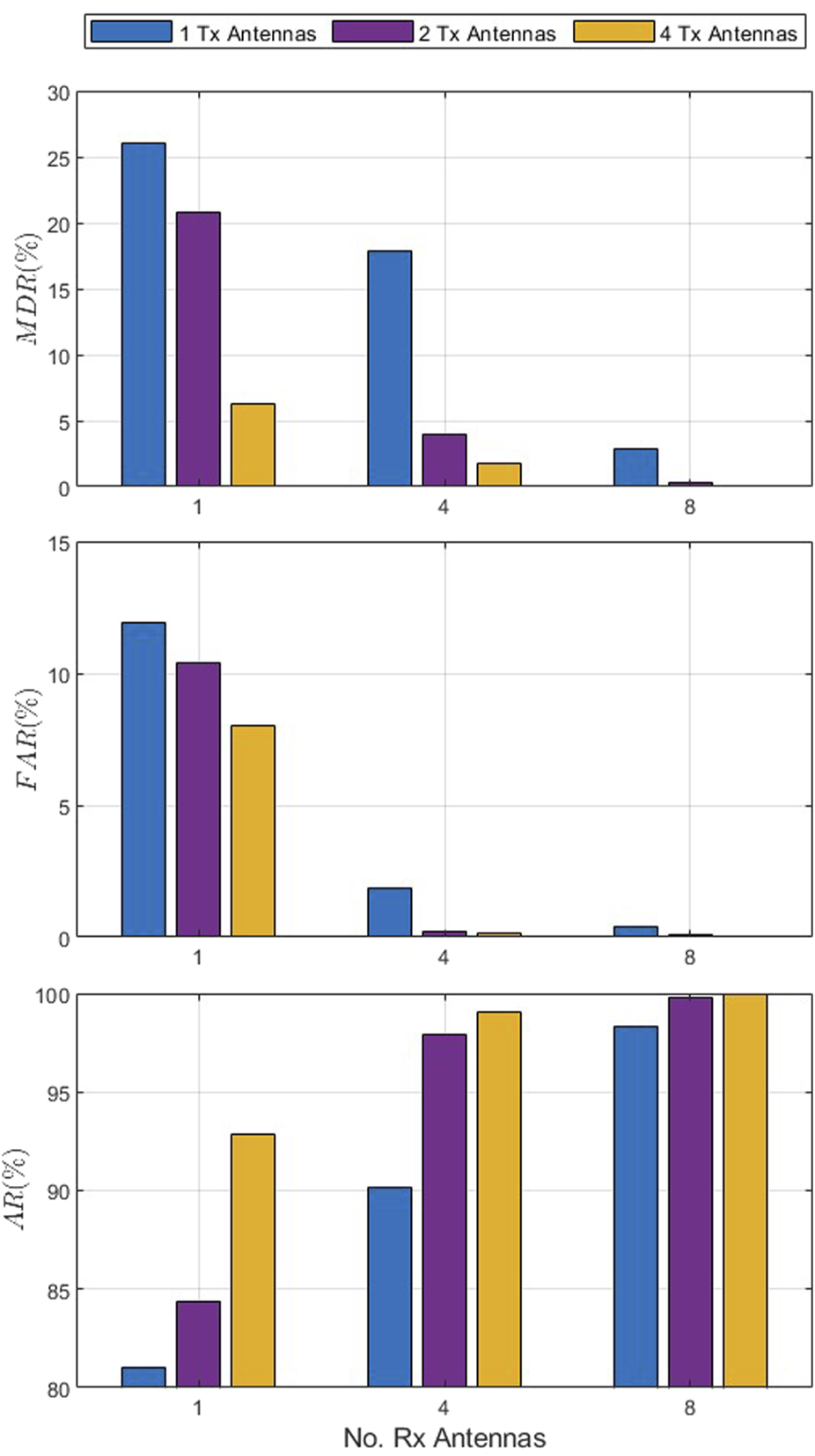 Figure 6 presents the MDR, FAR, and AR for the single-user scenario with an SNR of 8 dB, velocity of 0.4 km/h, and 1, 4, and 8 receive antennas. This shows that MDR, FAR, and AR improve with an increase in the number of antennas. For instance, with a single transmit antenna, the MDR decreases from 26.0% with 1 receive antenna to 17.8% with four receive antennas and 2.9% with eight receive antennas. Similarly, with four receive antennas, the MDR decreases from 17.8% with one transmit antenna to 4.0% with two transmit antennas and 1.7% with four transmit antennas. The FAR with a single transmit antenna decreases from 11.9% with one receive antenna to 1.9% with four receive antennas and 0.3% with eight receive antennas. In the case of four receive antennas, the FAR decreases from 1.9% with one transmit antenna to 0.2% with two transmit antennas and only 0.1% with four transmit antennas. The AR increases with an increase in the number of antennas. For example, with four receive antennas, the AR increases from 90.2% with one transmit antenna to 97.9% with two transmit antennas and 99.1% with four transmit antennas. These results illustrate the impact of antenna diversity on performance.