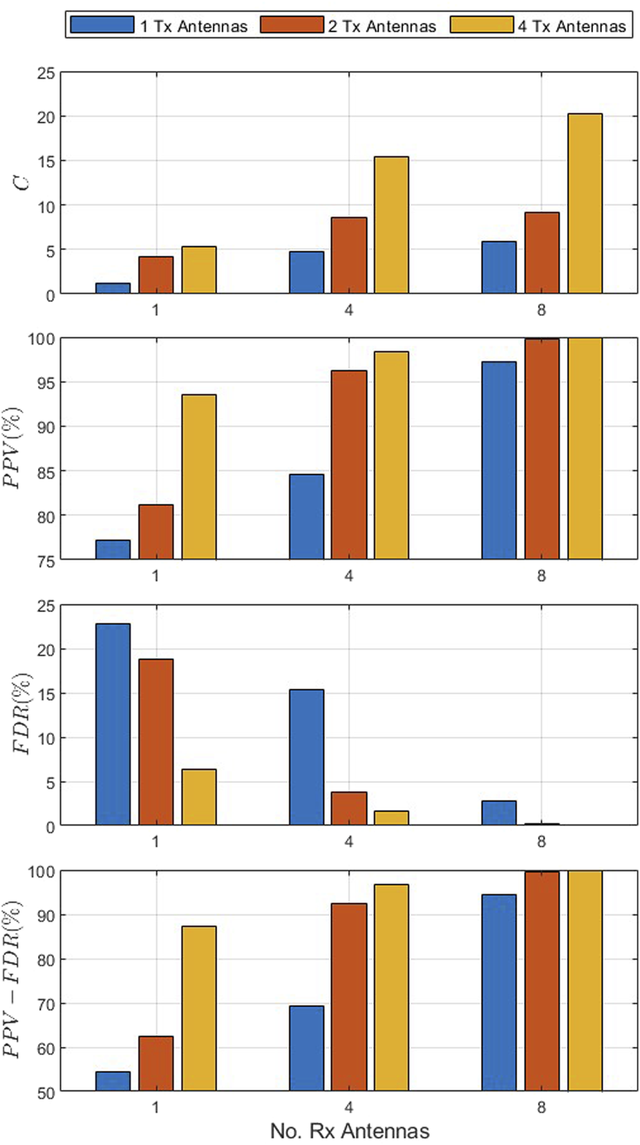 Figure 7 presents C, PPV, FDR, and PPV − FDR versus the number of receive antennas in the single-user scenario with an SNR of 8 dB, velocity of 0.4 km/h, and 1, 4, and 8 receive antennas. This shows that increasing the number of antennas improves C and thus, the information authentication rate IAR. With a single transmit antenna, C increases from 1.15 bps with one receive antenna to 4.75 bps with four receive antennas and 5.95 bps with eight receive antennas. Furthermore, the PPV increases, FDR decreases, and PPV − FDR increases with an increase in the number of antennas. For instance, with one transmit antenna, the PPV increases from 77.2% with one receive antenna to 84.6% with four receive antennas and 97.2% with eight receive antennas, while with four receive antennas, the PPV increases from 84.6% with one transmit antenna to 96.2% with two transmit antennas and 98.3% with four transmit antennas. In addition, with four receive antennas, the FDR decreases from 15.4% with one transmit antenna to 3.8% with two transmit antennas and 1.7% with four transmit antennas. The PPV − FDR also improves with an increase in the number of antennas as with four receive antennas, it increases from 69.2% with one transmit antenna to 92.3% with two transmit antennas and 96.6% with four transmit antennas. These results further illustrate the impact of antenna diversity on performance.