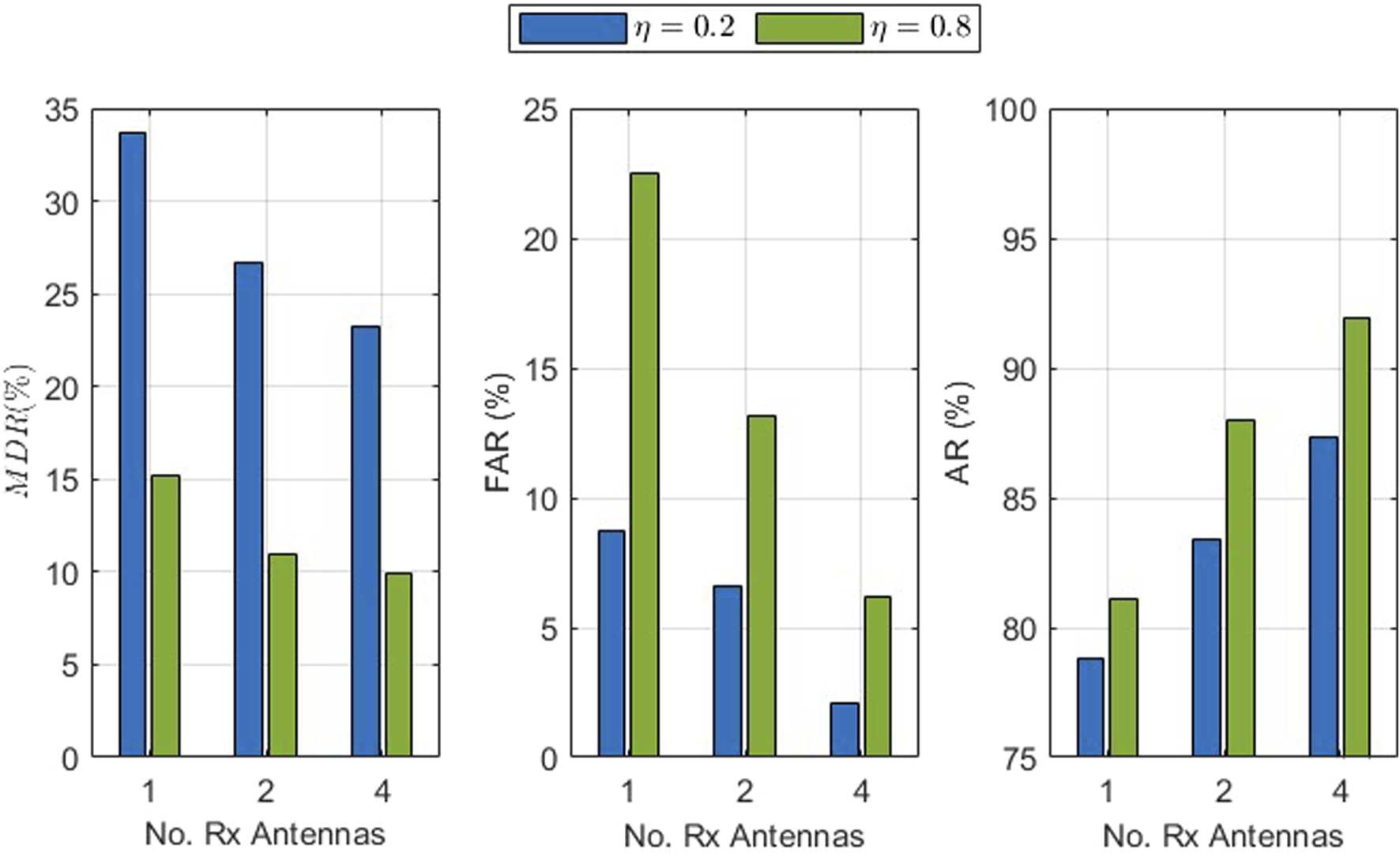 MDR, FAR, and AR versus the number of receive antennas for the single-user scenario with a signal-to-noise ratio (SNR) of 8 dB, velocity of 0.4 km/h, and 1, 4, and 8 receive antennas.
