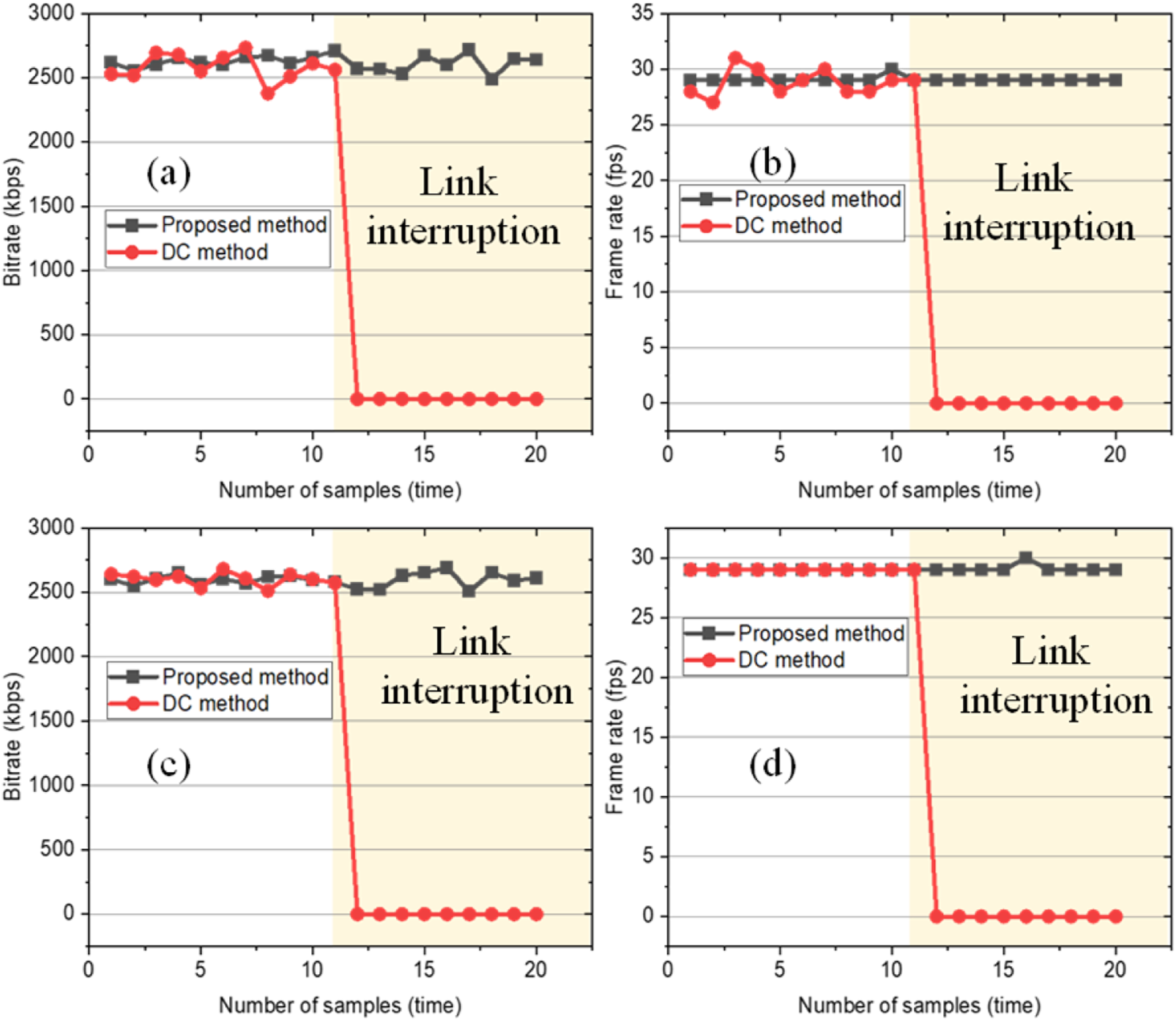 Figure 3. Network transmission performance results during link interruption. (a) Bitrate of the main data stream. (b) The frame rate of the main data stream. (c) The bitrate of the additional data stream. (d) The frame rate of the additional data stream.