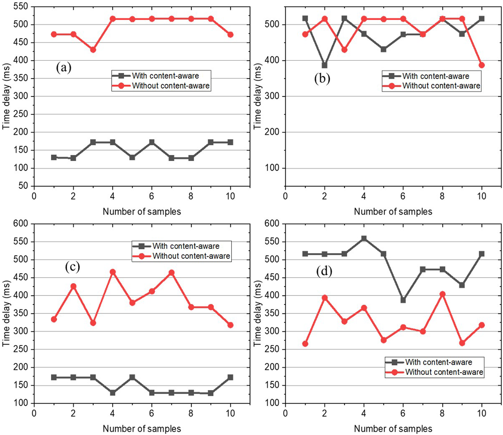 Figure 5. Time delay results when bandwidth is insufficient. (a) Differences in link latency (sufficient bandwidth). (b) Differences in link packet loss (sufficient bandwidth). (c) Differences in link latency (insufficient bandwidth). (d) Differences in link packet loss (insufficient bandwidth).