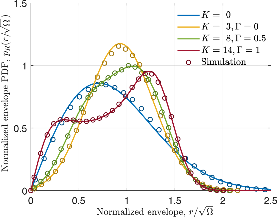 However, to date, little attention has been given to the development of small-scale fading simulators that account for more than one dominant specular component, such as those required for two-wave with diffuse power (TWDP) fading channels. In these channels, the received signal contains two strong specular components in addition to numerous low-power scattered waves, which can lead to unique propagation characteristics including a bimodal distributed envelope (Maric et al., 2021; Figure 4) and phase (Maric and Njemcevic, 2025; Figure 4) characteristics and, under the certain conditions, performance worse than those observed in Rayleigh channels (Maric et al., 2021; Figure 5), which cannot be modeled using the existing simulators.