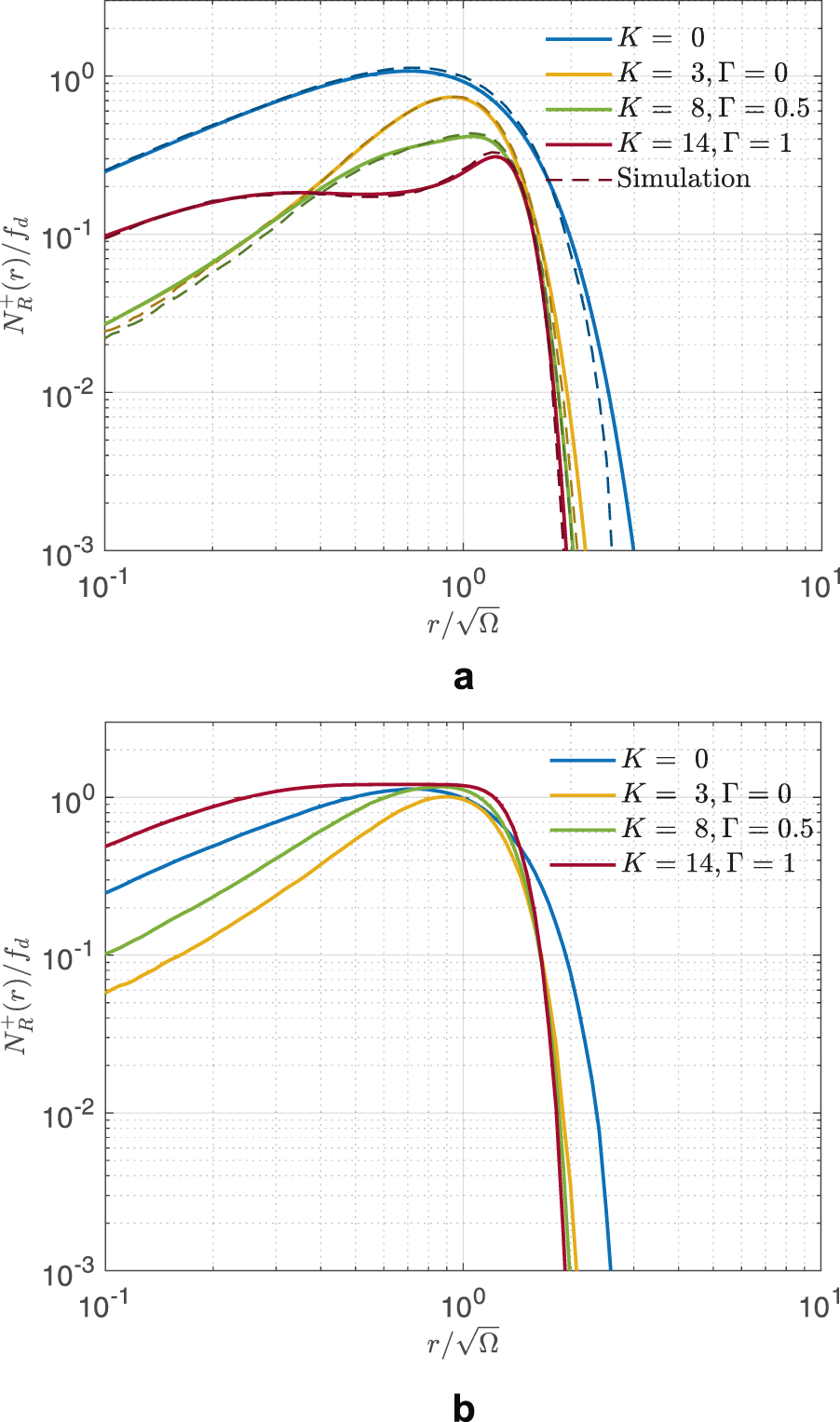 Although extensive simulations are performed to evaluate TWDP correlation statistics, due to the space limitations, only simulation results obtained for the real and imaginary part of the autocorrelation of the complex envelope, together with the autocorrelation function of the envelope square, are shown in Figures 2a–c.