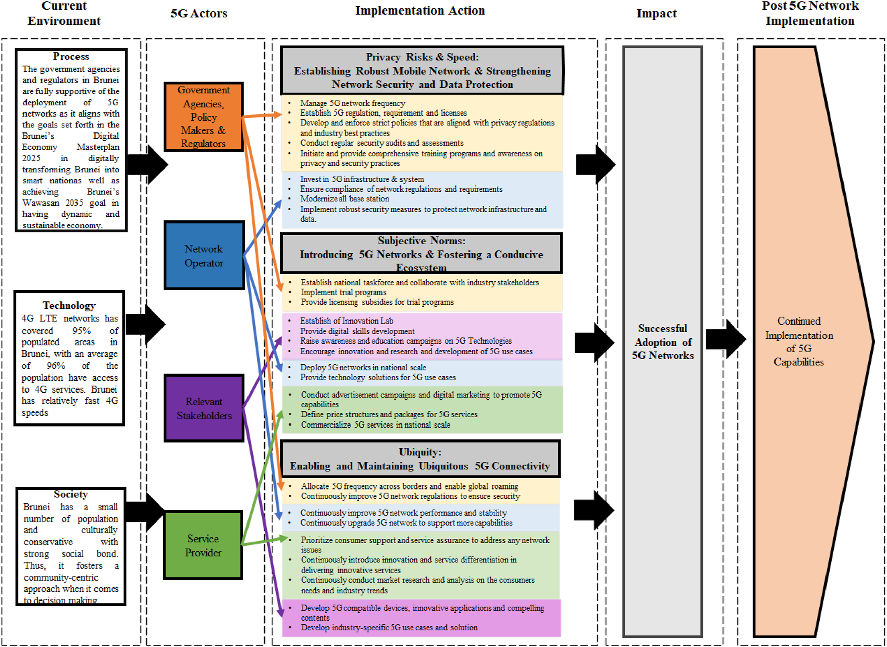 As 5G is still new and evolving, customers’ acceptance in adopting 5G networks in Brunei Darussalam remain uncertain. Despite the promising technological potential of 5G, issues relating to cybersecurity and privacy risks may possibly be one of the largest concerns that could create hesitancy in terms of adopting the technology. While 5G was built to ensure the reliability of connections with the improved bandwidth and speed performance, a tidal surge of new devices, gadgets and connections will make maintaining security much more challenging. For example, Cheng et al. (2021) studied attitude towards 5G networks in influencing the consumers’ intention to review and to purchase the 5G communication service has included factors such as privacy risks, speed, ubiquity, and subjective norms. Speed had a positive effect towards attitude towards 5G, highlighting that other factors that might contribute to consumer’s attitude in adopting 5G networks. Furthermore, while 5G is expanding rapidly across the countries, the research on the aforementioned factors is yet to be discussed amongst the researchers in Brunei. With the establishment of UNN to unify all the network infrastructures and base stations in Brunei Darussalam, it may facilitate the ubiquitous networks, connectivity, and technology. This enables the consumers to access the 5G mobile network from any location in Brunei, regardless of which mobile service providers they subscribe from.