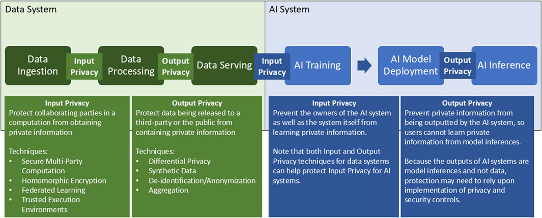 AI systems typically process data according to the following steps: 1) AI Training, where an AI model is trained to fit the data served by data systems; 2) AI model deployment, where the trained AI model is deployed on a computational system, and 3) AI inference, where the AI model is used to make predictions, recommendations, and decisions. AI training parallels the data ingestion step and AI inference parallels the data service step in data systems. As such, Input and Output Privacy considerations can be applied accordingly upon those steps as well. Input Privacy for an AI system applies to the data used for model training, protecting privacy by preventing the AI system and its developers from learning private information. Output Privacy applies to AI inferences, reducing the risk that the AI outputs private information to system users.