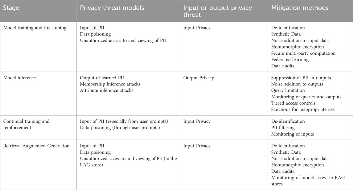 Table 1. Threat models and mitigation strategies for each step in AI system training and deployment.