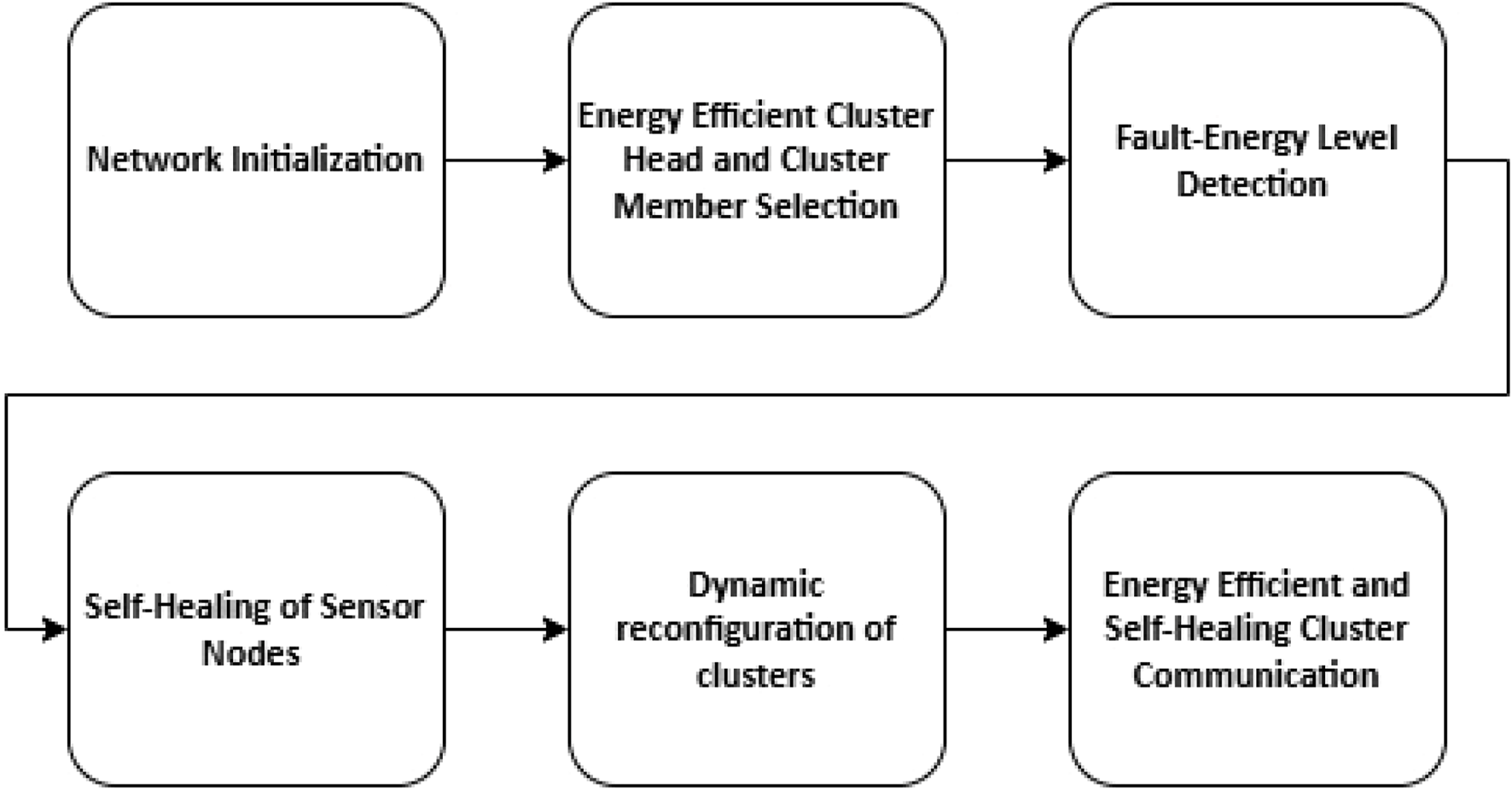 Self-healing techniques hold key properties of WSNs, like the routing process and dynamic power distribution, to create stable networking and secure data transmissions. Self-sufficient sensor nodes work together to collect and analyze data. Wireless sensor networks face various security threats, including jamming attacks that disrupt communication channels. To counter such disruptions, self-healing mechanisms are employed to restore network functionality. Self-healing mechanisms can also be triggered when a sensor node depletes its energy or becomes unresponsive due to malfunction. The main network properties are rerouting, which dynamically redirects the data through alternative paths. While maintaining network connectivity, a power allocation will adjust the transmission power. Nodes will work together in detecting, avoiding, or mitigating the effects of jamming attacks with the cooperation mechanism. This helps communication between the nodes and maintains the energy levels for better transition of packets. Self-healing has a strong connection with clustering approaches, where both aim to optimize network topology for improving energy efficiency and data integrity (Jiang et al., 2024).