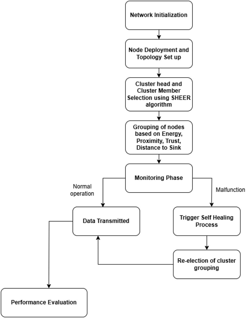 A flow diagram for self-healing and energy-efficient clustering algorithm for WSN optimization is shown in Figure 3. It is a systematic sequence intended to address fundamental challenges like energy consumption, network stability, and dynamic node failures. The proposed approach combines several improvements, such as an adaptive clustering technique for effective CH selection, a self-healing process to dynamically recover from node failures, and an energy-conscious optimization technique. These elements cooperate to provide extended network lifetime, enhanced data transmission reliability, and reduced energy wastage. The initial phase is network initialization and clustering. It is the deployment of sensor nodes and grouping of sensor nodes on the basis of important feature parameters like energy, distance to the sink, and trust based on successful packets delivered by the node. In the proposed SHEER, the best CHs are dynamically chosen to achieve energy consumption balance and stability. The clustering process minimizes communication overhead while improving data aggregation efficiency.