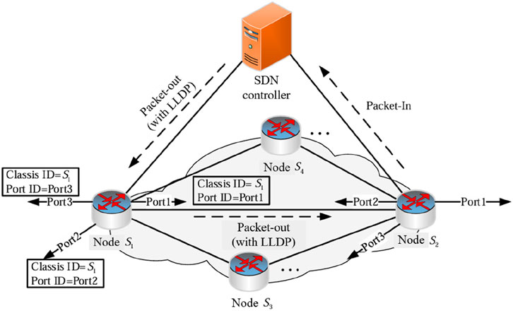 The link layer discovery protocol (LLDP) (Chang et al., 2020) is used in the SDN network to obtain the network topology structure. The main principle is shown in Figure 1, the controller periodically sends a Packet-Out message encapsulating LLDP data packet to the S1 node of the data plane through the OpenFlow channel. Upon receiving the Packet-Out message, node S1 processes it and forwards it via the designated port to node S2. Since S2 cannot find a matching flow table entry for the incoming packet, it responds by sending a Packet-In message to the controller. The controller then interprets this message to generate identifiers—such as Classis ID and Port ID—that help recognize neighboring nodes and their associated ports. Other adjacent nodes are identified in the same way, and finally the entire network topology structure is obtained.