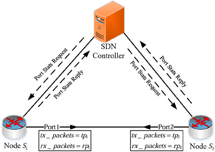 The packet loss rate measurement method of the SDN link is shown in Figure 4. The controller sends a Port Stats Request message to nodes S1 and S2 to query the node status. The node replies with a Port Stats Reply message. The controller parses the data packet of the reply message and obtains the number of sent data packets