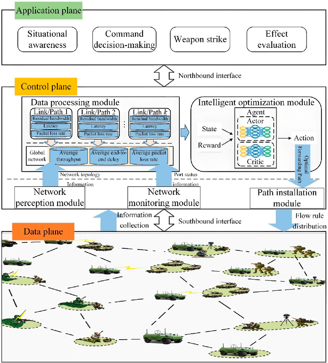 The SDN architecture decouples network control from data forwarding, thereby improving resource utilization and enhancing network transmission performance. This separation offers new opportunities for enabling resilient and adaptive tactical communication networks with intelligent capabilities (Bale et al., 2023). Accordingly, this study designs a tactical communication network path optimization system architecture based on SDN, as illustrated in Figure 5, which comprises three layers: the data layer, control layer, and application layer.